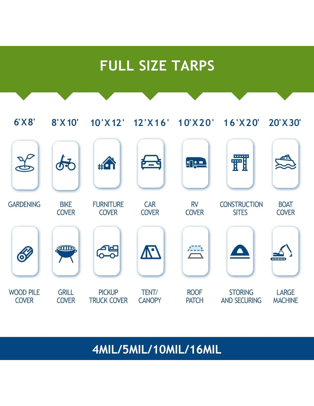 - Tamaño Final: Nuestra lona versátil viene en tamaños que van desde 6 x 8 pies (1.83x2.44 metros) hasta 20 x 30 pies (6.10x9.14 metros), con opciones en varios colores y grosores para satisfacer tus necesidades. Elige entre 5Mil para protección ligera y a corto plazo; 10Mil para tareas de mediana resistencia y refugio diario; o 16Mil para construcción de alta resistencia y uso a largo plazo. Perfecta para actividades al aire libre o proyectos en casa, la lona SUNLITAP ofrece resistencia, portabilidad y un valor excepcional.