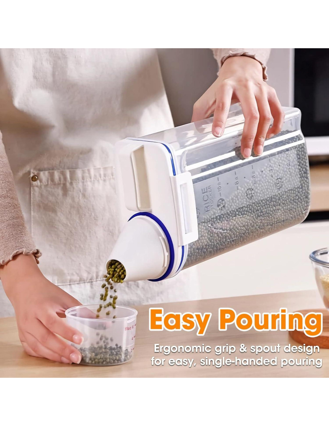 - Vertido Fácil: El contenedor de almacenamiento de arroz cuenta con un pico vertedor que facilita la dispensación de tus ingredientes. Su diseño ergonómico ofrece un agarre cómodo para un vertido fácil con una sola mano