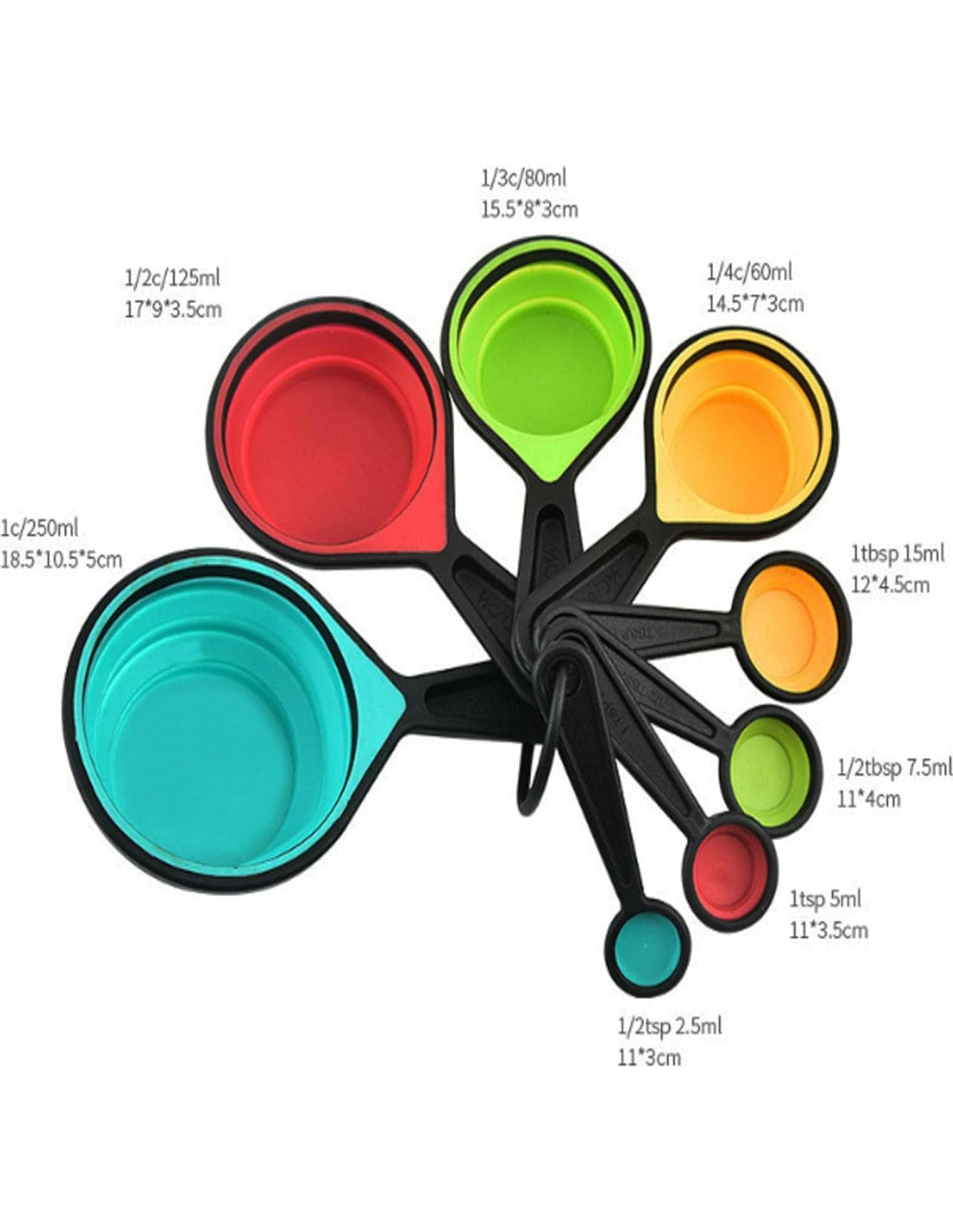 - Medición conveniente: Este juego de 8 piezas incluye tazas medidoras colapsables en tamaños de 1/4 taza (59 ml), 1/3 taza (79 ml), 1/2 taza (118 ml) y 1 taza (237 ml) junto con cucharas medidoras en 1/4 cucharadita (1.25 ml), 1/2 cucharadita (2.5 ml), 1 cucharadita (5 ml) y 1 cucharada (15 ml) para medir fácilmente ingredientes secos y líquidos.