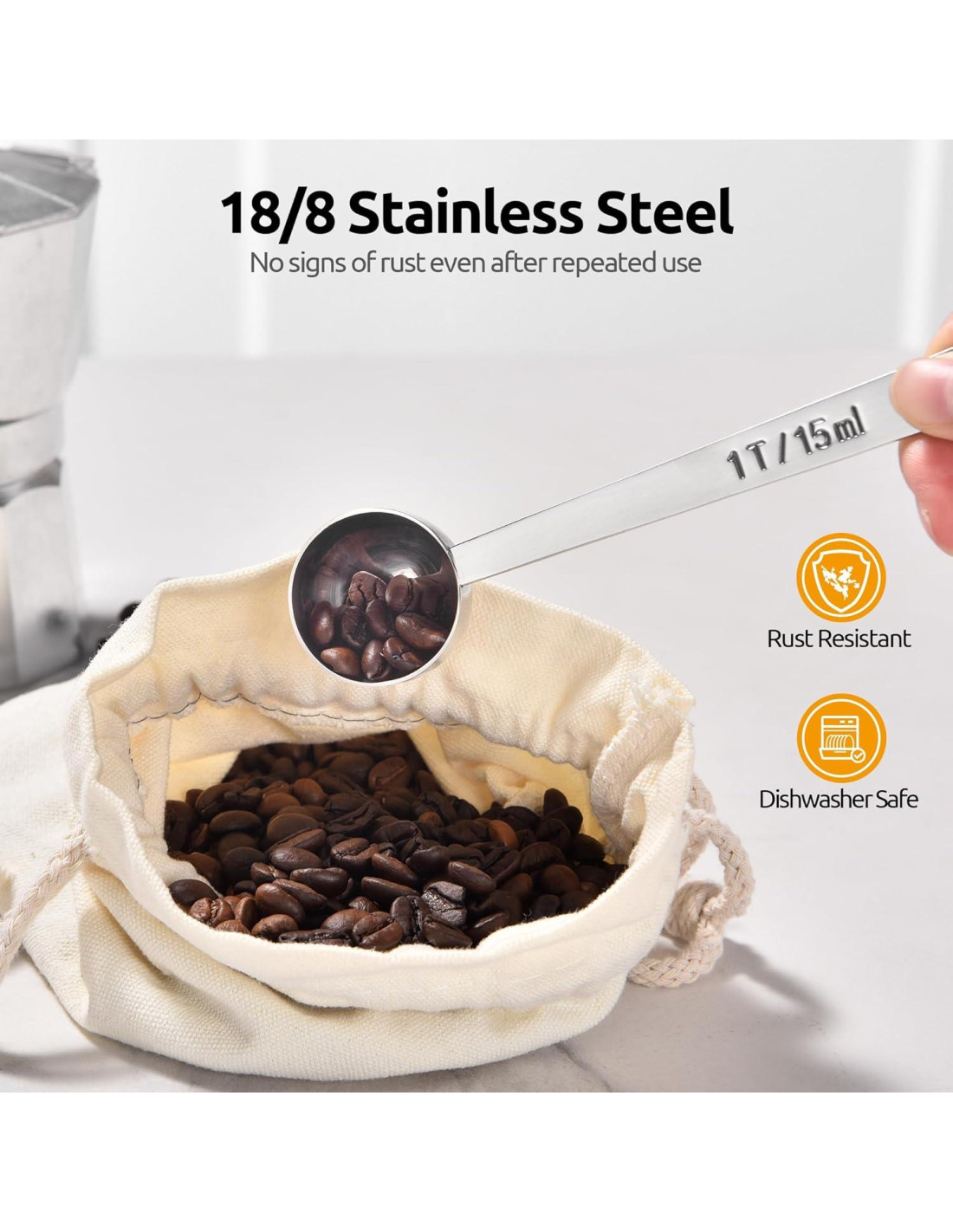 - [Acero Inoxidable 18/8 de Grado Alimenticio] Las cucharas de café U-Taste están hechas de acero inoxidable 18/8 de grado alimenticio engrosado. Sin problemas de oxidación, rotura o astillado. Soporta más peso que una cuchara de plástico. Sostiene fácilmente una cucharada completa de café molido sin derrames. Bordes redondeados y pulidos sin rebabas que lastimen tus dedos al lavar tu cuchara de cucharada. Las cucharas medidoras de café U-Taste son aptas para lavavajillas y fáciles de limpiar.