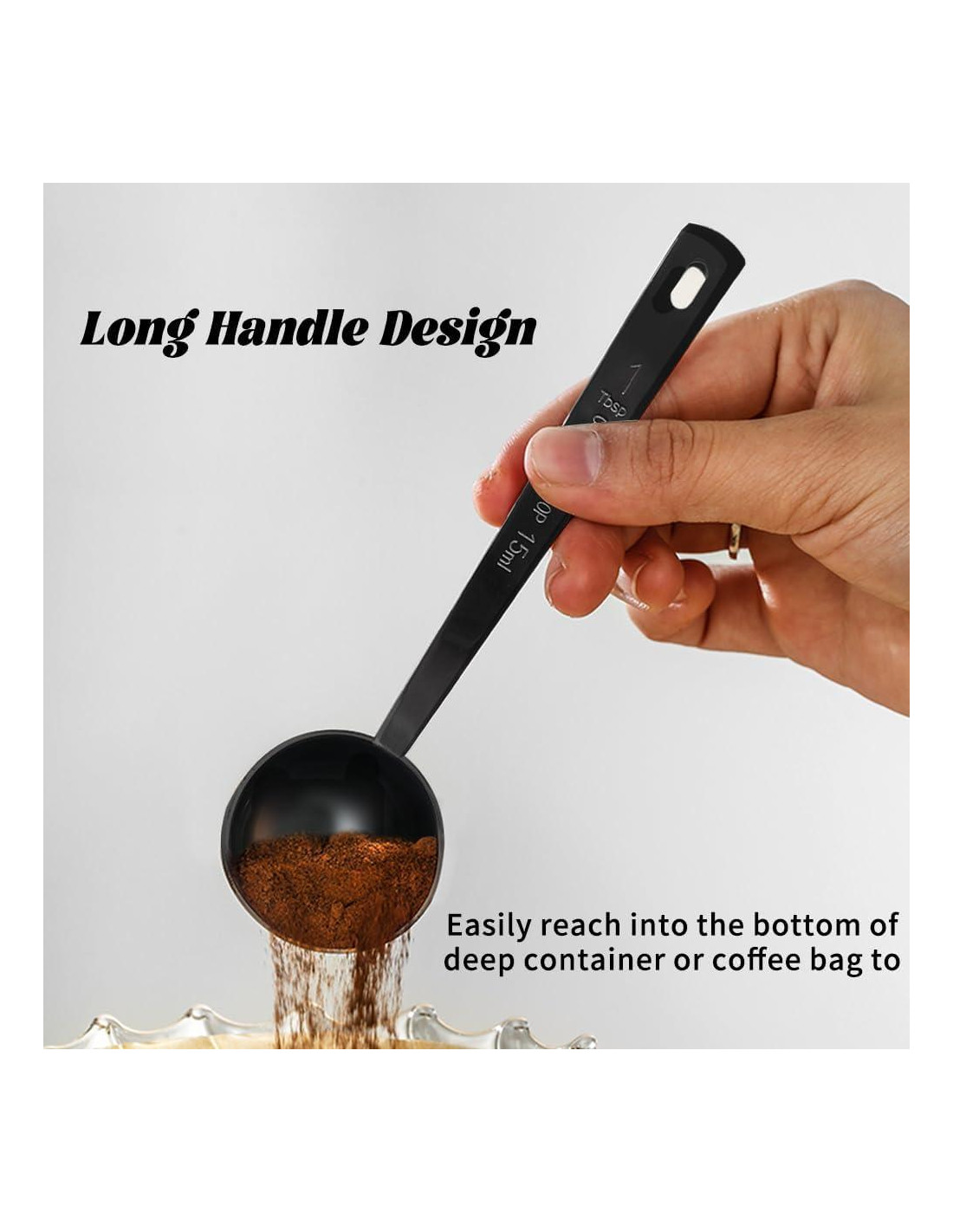 - [Diseño razonable] El mango de la cuchara medidora de café mide 11 cm (4.33 pulgadas) de largo, el mango largo está diseñado para usarse en recipientes altos o bolsas y puede alcanzar fácilmente el fondo de recipientes profundos o bolsas de café para sacar café. El diseño del agujero para colgar al final del mango se puede usar para almacenamiento colgado, reduciendo la ocupación del espacio en la cocina.