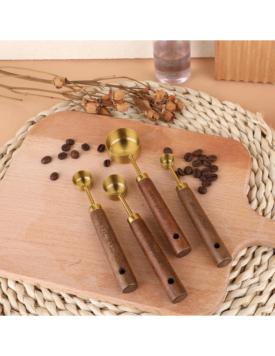 - [Material Confiable] El juego de llaves medidoras está hecho de acero inoxidable de alta calidad, tiene un mango de madera, es duradero y no es fácil de oxidar. El proceso de coloración por electroplating le da a las tazas y cucharas un hermoso color dorado con ingredientes no tóxicos.