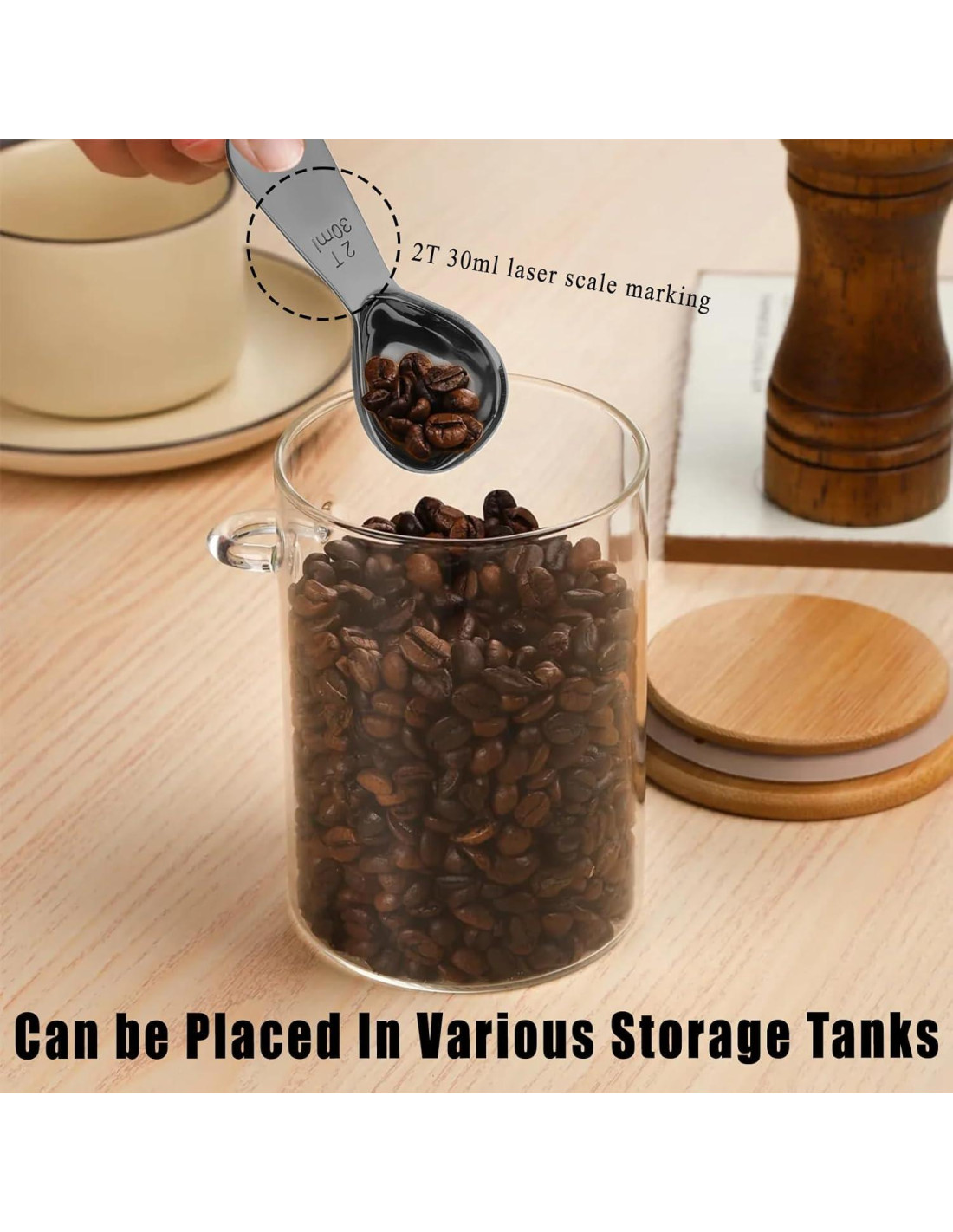 - Diseño multiuso: Sirve granos de café, especias, té suelto o ingredientes de repostería. Forma delgada permite almacenamiento vertical en frascos.