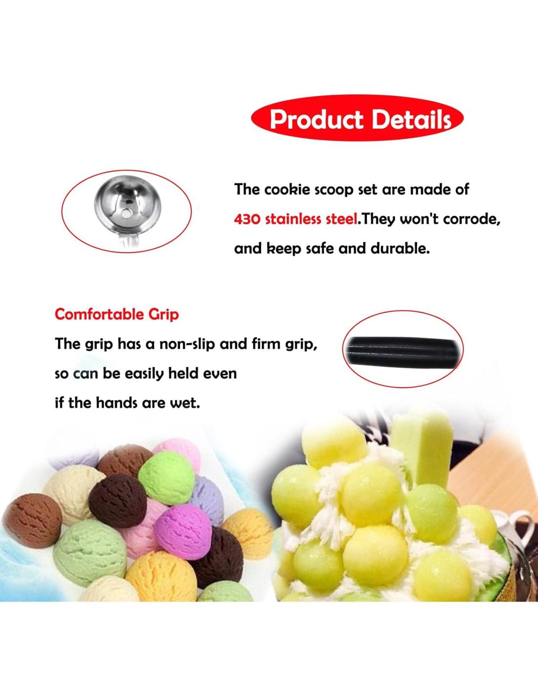 - Múltiples usos: Las cucharas para melón son de doble cara, la cuchara de ambos lados no es la misma, 2 tamaños diferentes para más usos, puedes usar diferentes tamaños de cuchara como cuchara de helado, cuchara para galletas, cuchara para melón, cuchara para cupcakes, cuchara para albóndigas, incluso como cuchara medidora para satisfacer diferentes necesidades.
