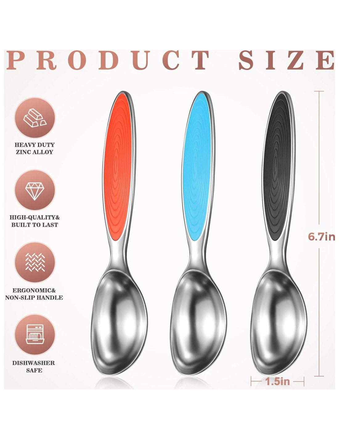 - 3 PAQUETE DE CUCHARAS DE HELADO ERGONÓMICAS: Mantén la preparación de postres dulce con estas cucharas que cortan eficientemente el helado, sorbete y yogur congelado, sin importar cuán frío esté. Diseñamos estas herramientas con un mango ergonómico en ángulo para darte una palanca excepcional y cucharas de zinc fundido fuertes para servir helado perfectamente.