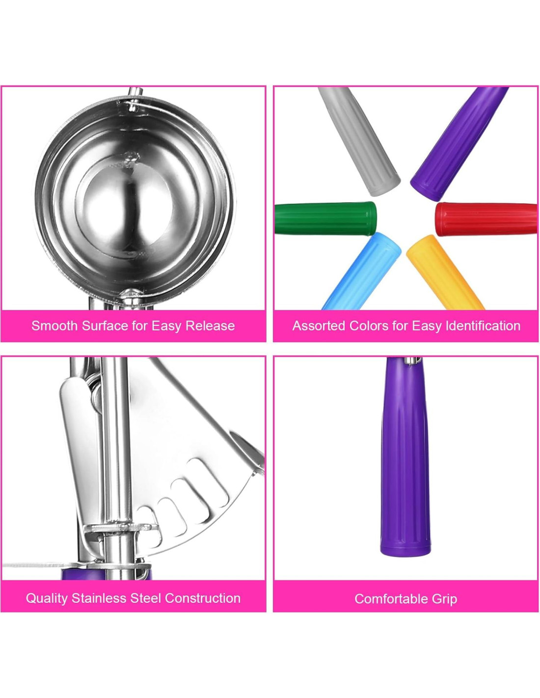 - Conveniencia codificada por colores: Cada cuchara para helado para hornear en gris, verde, azul, amarillo, rojo y púrpura corresponde a un tamaño, simplificando la identificación durante sesiones de cocina ocupadas. Un bonito juego de cucharas para galletas para panaderos organizados, facilitando la diferenciación entre tamaños al preparar múltiples galletas u otros alimentos a la vez.