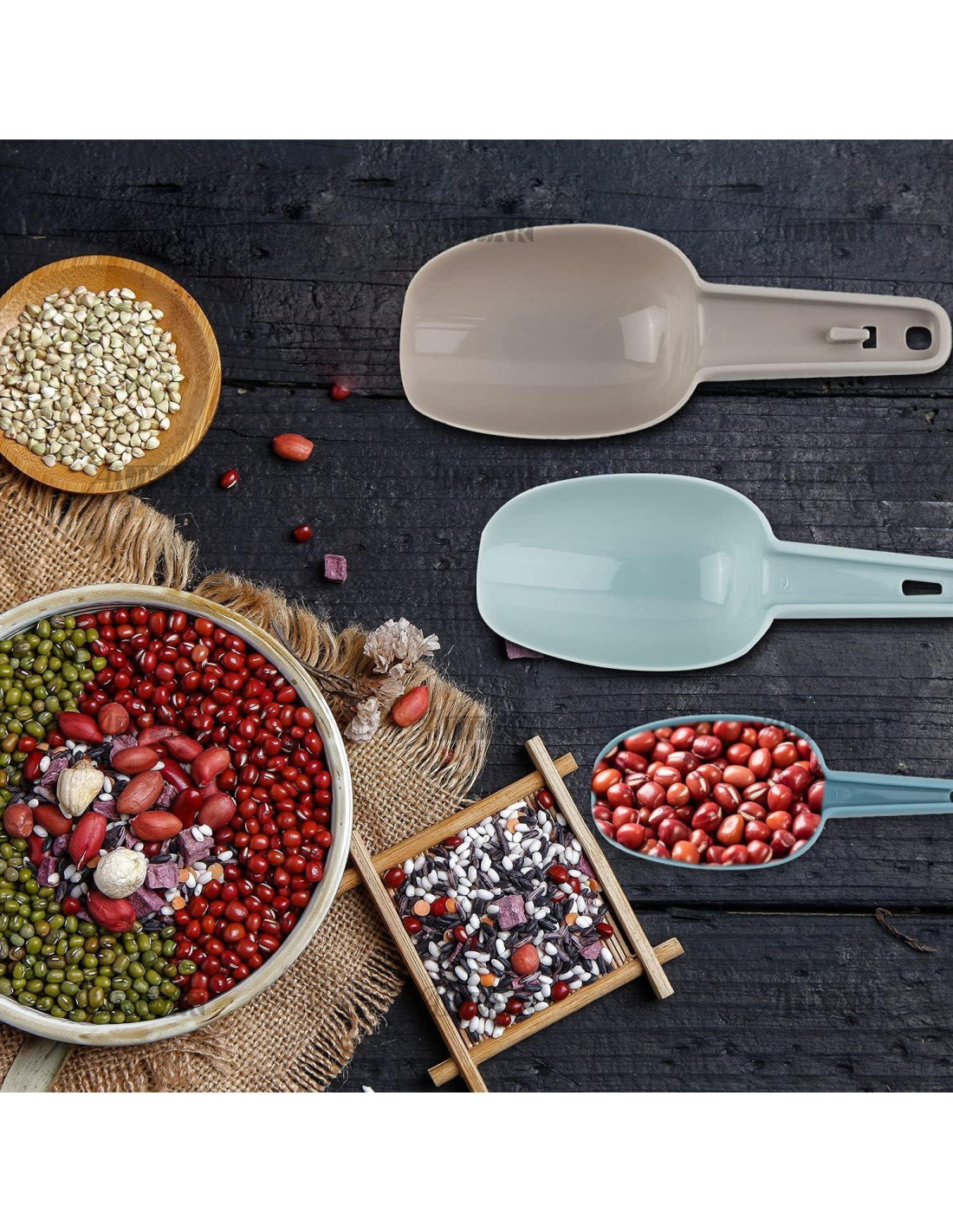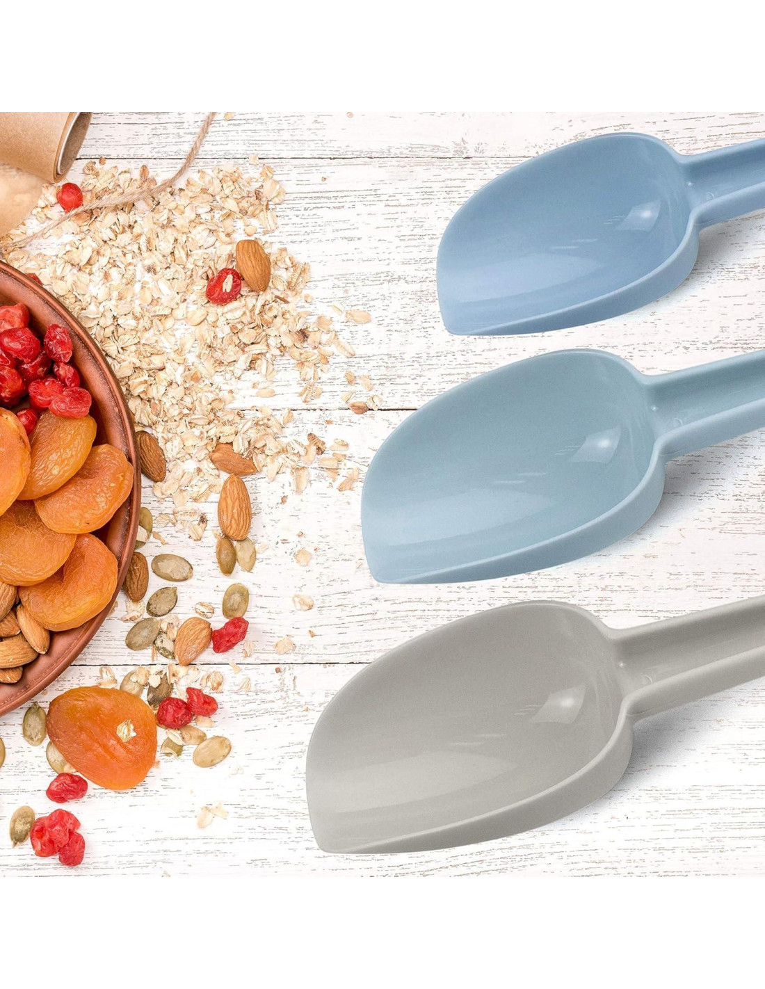 - Amplia Aplicación: 3 tamaños de cucharas adecuadas para cubitos de hielo, azúcar, harina, alimentos secos, dulces, palomitas, cereal, granos de café y comida para mascotas. Perfecto para bodas, fiestas de dulces, bufés, cualquier polvo, ingredientes para hornear, manualidades, sales de baño, etc.