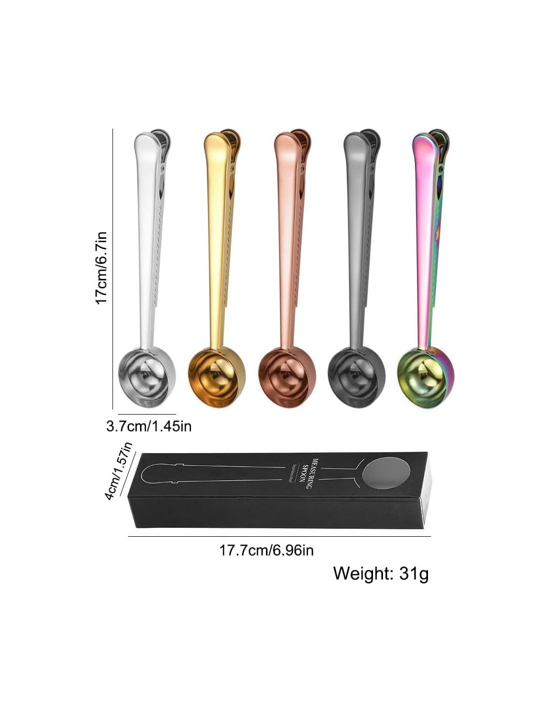 Color: Plata, Oro, Oro Rosa, Mágico, Negro Uso: Sellado de bolsas de alimentos, cuchara medidora de café Paquete incluye: 5 x Cucharón de Café y Clips para Bolsas [Acero inoxidable] - Cuchara medidora de café de acero inoxidable de grado alimenticio 304, duradera, sin deformación. Tamaño (Aproximado): 17 x 3.7 cm (6.7 x 1.48 in). [Diseño innovador 2 en 1] - Cuchara de café con clip, sellada después de su uso, para mantener el café saludable, fresco, buen sabor, clip de sellado con resorte fuerte, sellado más firme, no fácil de deslizar. También es ideal para sacar granos de café, café en polvo, cacao en polvo, té, azúcar, especias o leche en polvo. Una amplia gama de usos para satisfacer tus diferentes necesidades, un artículo imprescindible para cada familia. [Buen sellado, sin fugas] - Los clips de cuchara de café de acero inoxidable no dañarán tu bolsa de café, pero sellan el aire bastante bien. Es perfecto para uso diario, de viaje o en la oficina. Tamaño pequeño, fácil de llevar. Ten en cuenta que este clip es adecuado para artículos más gruesos. Si la bolsa de café solo está doblada en una capa y no se puede sujetar, debes doblar varias capas más para sujetarla. [Paquete incluye] - Un juego de 5 clips de cuchara de café, incluyendo 5 colores diferentes, textura exquisita, con empaque en caja de colores. Se puede usar en cafeterías, en casa o en la oficina. Comienza a disfrutar de la taza de café perfecta. [Hermoso y a la moda] - Pulido de superficie como un espejo, destacando el gusto. Un buen regalo para su cumpleaños, aniversario, Navidad, Día de San Valentín, etc. Los clips de cuchara de café son fáciles de limpiar y aptos para lavavajillas, perfectos para la decoración del hogar o la cocina. Notas: 1) Debido a las diferencias entre las diferentes pantallas, la imagen puede no reflejar el color real del proyecto. 2) BUEN SERVICIO QUE OBTENDRÁS: Amamos a nuestros clientes, tu satisfacción es nuestra prioridad, contáctanos si tienes alguna pregunta, haremos nuestro mejor esfuerzo para resolver cualquier problema que encuentres. ¡ESPERO QUE TENGAS UNA BUENA COMPRA!