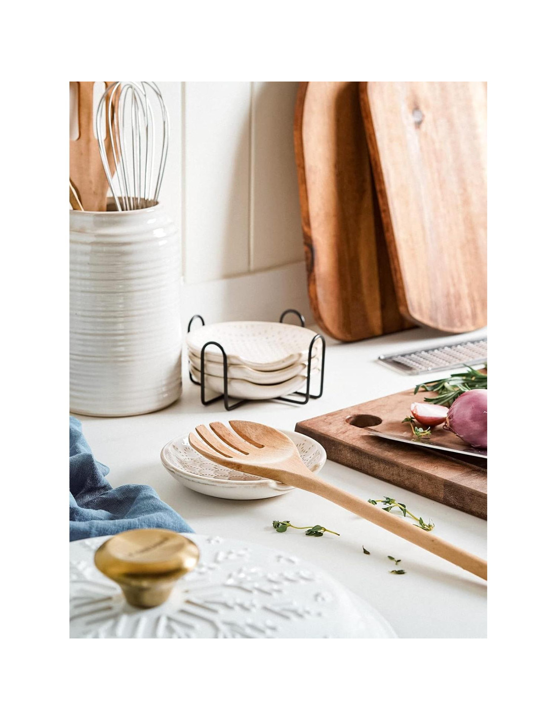 - Qué recibirás: Cuatro diferentes diseños en relieve de cerámica elegantes soportes para cucharas y 1 soporte de metal. Dimensiones 4.8" (12.19 cm) W x 1" (2.54 cm) H. Hay una buena idea de regalo para inauguración de casa. A los nuevos propietarios les gustará el aspecto atemporal de granja de estos soportes para cucharas