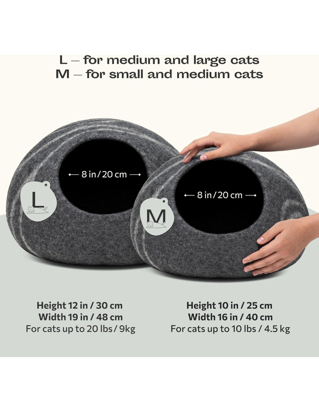 - HECHO CON AMOR: La cueva premium para gatos de Meowfia está cuidadosamente hecha a mano de 100% lana merino. Es ultra duradera, pero súper suave, ligera y portátil. Regalo perfecto para gatos queridos y amantes de los gatos. Dado que este producto está hecho de lana 100% natural, las dimensiones pueden variar ligeramente, y es importante seguir nuestras pautas de cuidado para mantenerlo luciendo genial el mayor tiempo posible. Además, si buscas una manera de hacer que tu gatito le guste su nuevo escondite, puedes intentar llenarlo con tu ropa primero.