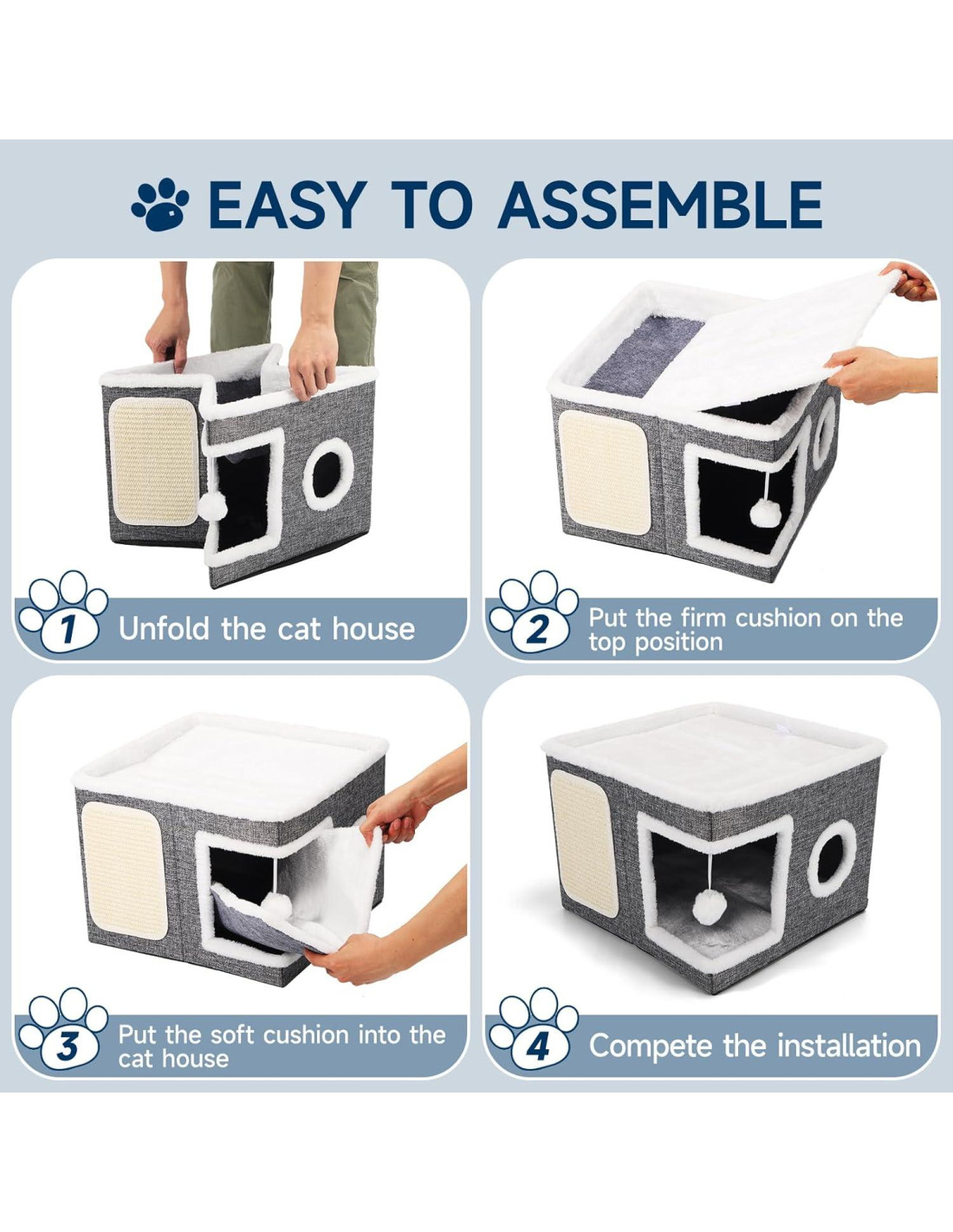 - Fuerte Capacidad de Peso y Estabilidad: La cama para gatos está hecha de un tablero de densidad reforzado y engrosado, asegurando una capacidad de carga de hasta 13.6KG. Incluso los gatos más traviesos pueden saltar y jugar libremente sin causar que la casa para gatos se colapse. El diseño antideslizante en la parte inferior evita que la cama para gatos se sacuda fácilmente.