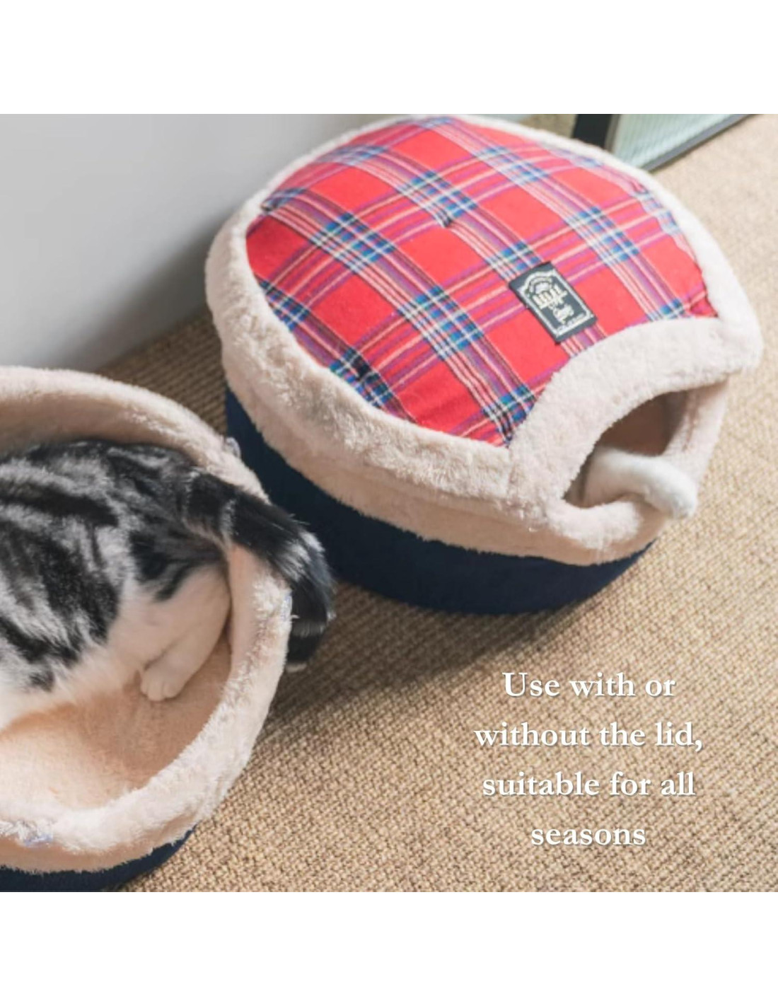 Dale a tu gato un refugio acogedor con esta encantadora cama cueva de cuadros. Con un suave interior de corduroy, tapa desmontable y diseño acogedor, es perfecta para gatos que aman escarbar y relajarse con estilo. Fácil de limpiar e ideal para la comodidad durante todo el año.