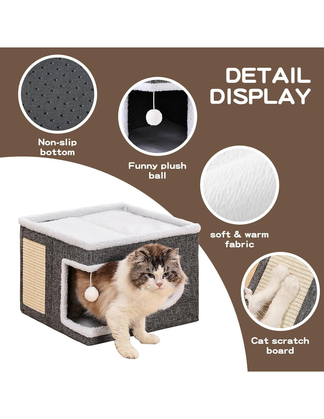 - Construcción Robusta y Estable Las casas para gatos de interior están hechas de un tablero MDF resistente y ligero, permitiendo que gatos de hasta 13.61 kg salten y jueguen libremente sin preocuparse por colapsar. El diseño antideslizante en la parte inferior evita que la cama cubierta para gatos se sacuda o mueva mientras tu amigo felino se divierte.