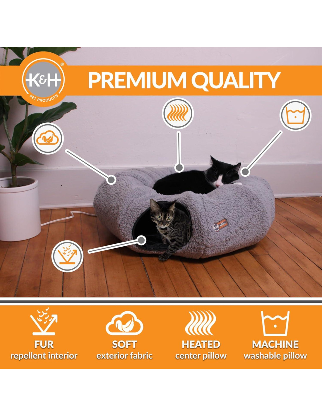 Presentamos la Cama Túnel Calentada Thermo-Kitty de K&H Productos - ¡un refugio multifuncional para felinos en forma de túnel de donut! Esta innovadora cama para gatos calentada combina a la perfección calidez, diversión, comodidad y versatilidad en un diseño elegante. Descomprime la cueva de gato en forma de donut para revelar un escondite estilo acordeón que se colapsa fácilmente para un almacenamiento conveniente. Elaborada con una almohada de poliéster de felpa suave de 23cm asegurada en el centro con sujetadores de gancho y bucle, y con dos agujeros de 18cm a los lados, esta cama túnel para gatos asegura horas de entretenimiento y relajación para tu amigo peludo. La almohada es lavable a máquina (después de quitar el calentador), y el túnel de tubo para gatos presenta un interior de nailon único que se limpia fácilmente. Elige la versión calentada de 4 vatios para mayor calidez o la opción sin calefacción. Este túnel para gatos calentado está listado por MET y respaldado por nuestra garantía limitada de un año, esta cama túnel para gatos de K&H es la mezcla perfecta de diversión y calidez acogedora. Para uso en interiores con corriente eléctrica de 110/120 voltios solamente. Diseñado por K&H con MÁS de 20 años de experiencia en la creación de productos seguros, innovadores y de calidad para mascotas.