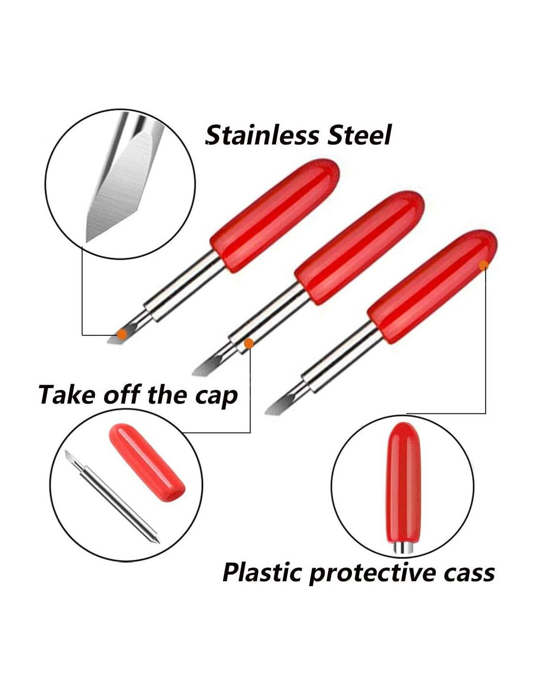1. Para evitar rasguños en los dedos, las cuchillas están dentro de la cubierta de goma, por favor sáquelas de la cubierta al usarlas. 2. La punta hecha de carburo cementado puede seguir siendo afilada y duradera para cortes prolongados, la varilla de la cuchilla hecha de acero inoxidable premium molido y pulido es capaz de resistir el desgaste.