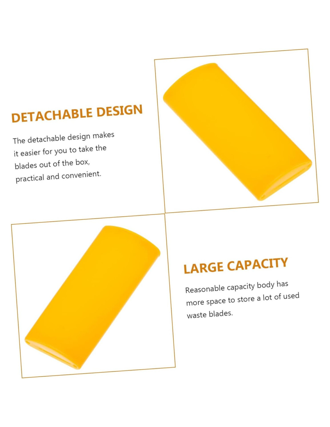 Lista del Paquete 1 x caja de almacenamiento de cuchillas de desecho Características - Tamaño: 9.00X3.50X1.50cm (3.54X1.38X0.59in) banco de cortadores. - Color: Lata de desecho de cuchillas naranja. - Material: Plástico, contenedor de desecho de cuchillas ABS. - Es fácil de desensamblar y desechar cuchillas de desecho, se puede reutilizar y es un dispositivo de desecho de cortadores. - Proporcionará una buena experiencia de usuario, para evitar lesiones accidentales causadas por la colocación de cuchillas desechadas en contenedores de almacenamiento de cuchillas. - Diseñado para un desecho seguro y conveniente de cuchillas de desecho usadas, muy fácil de usar y colocar el caso de desecho. - Adecuado para el hogar personal, oficina, dormitorio, etc. Amplio rango de aplicación, contenedores prácticos y duraderos para cuchillas de rasurar usadas. - Hecho de material plástico ABS premium y duradero, nuestra caja de almacenamiento de cuchillas de desecho es un contenedor de almacenamiento de cuchillas muy duradero. Descripción de los productos contenedor de desecho de cuchillas Hecho de material premium y resistente, nuestra caja de almacenamiento de cuchillas de desecho tiene un tiempo de servicio muy duradero. almacenamiento de desecho Es multifuncional y muy práctico, que no solo se puede usar como dispositivo de cortador roto, sino también como una caja de almacenamiento de cuchillas. desecho de cuchillas utilitarias resuelve el problema de no tener dónde almacenar cuchillas de desecho.