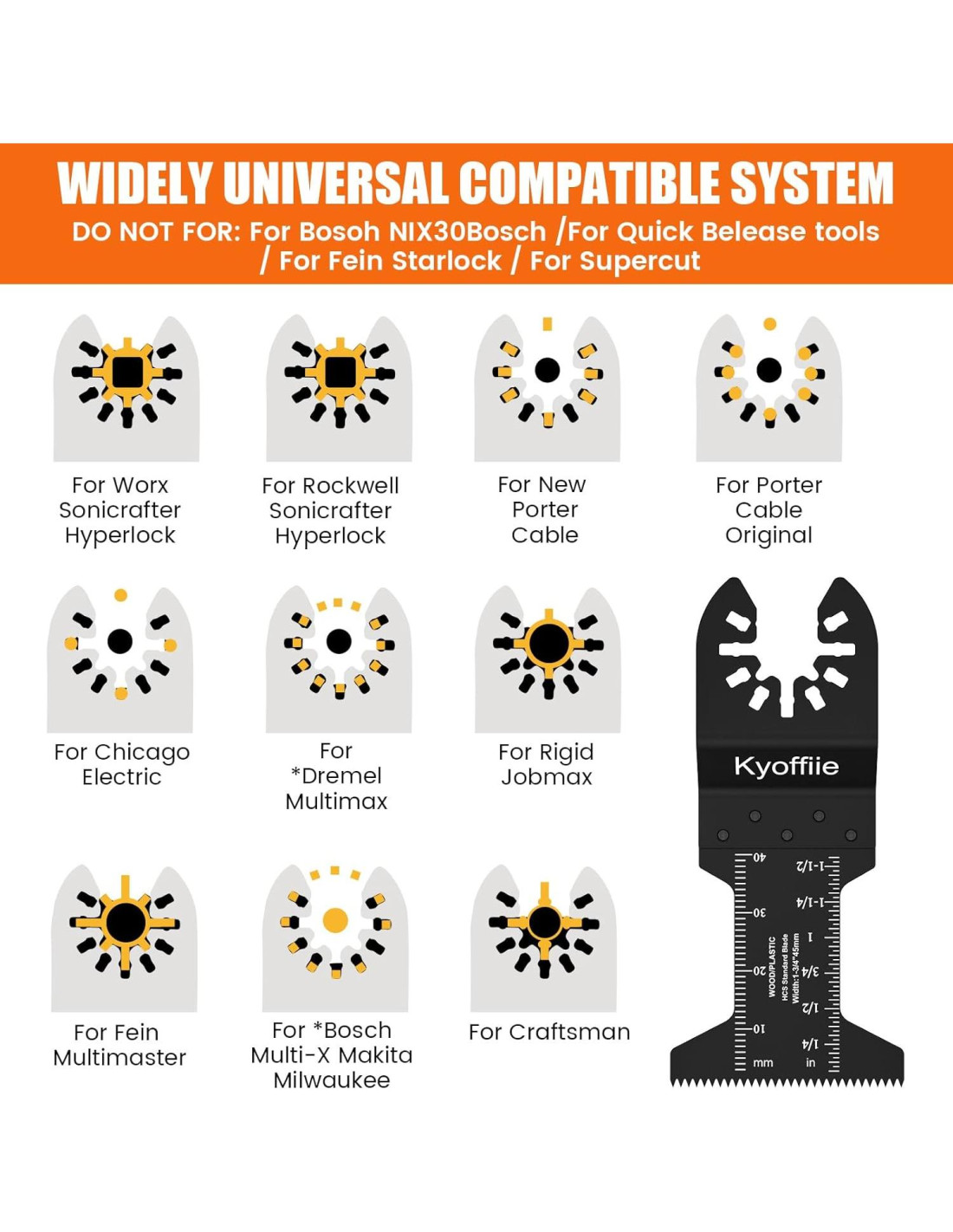 - [Sistema Compatible Universal] - Nuestras cuchillas de sierra de liberación rápida son compatibles con Fein Multimaster, Bosch, Porter Cable, Rockwell, Ryobi, Milwaukee, Black & Decker, Dewalt, Craftsman y más, las cuchillas de multiherramienta oscilante son adecuadas para más del 95% de las marcas de herramientas oscilantes en el mercado.