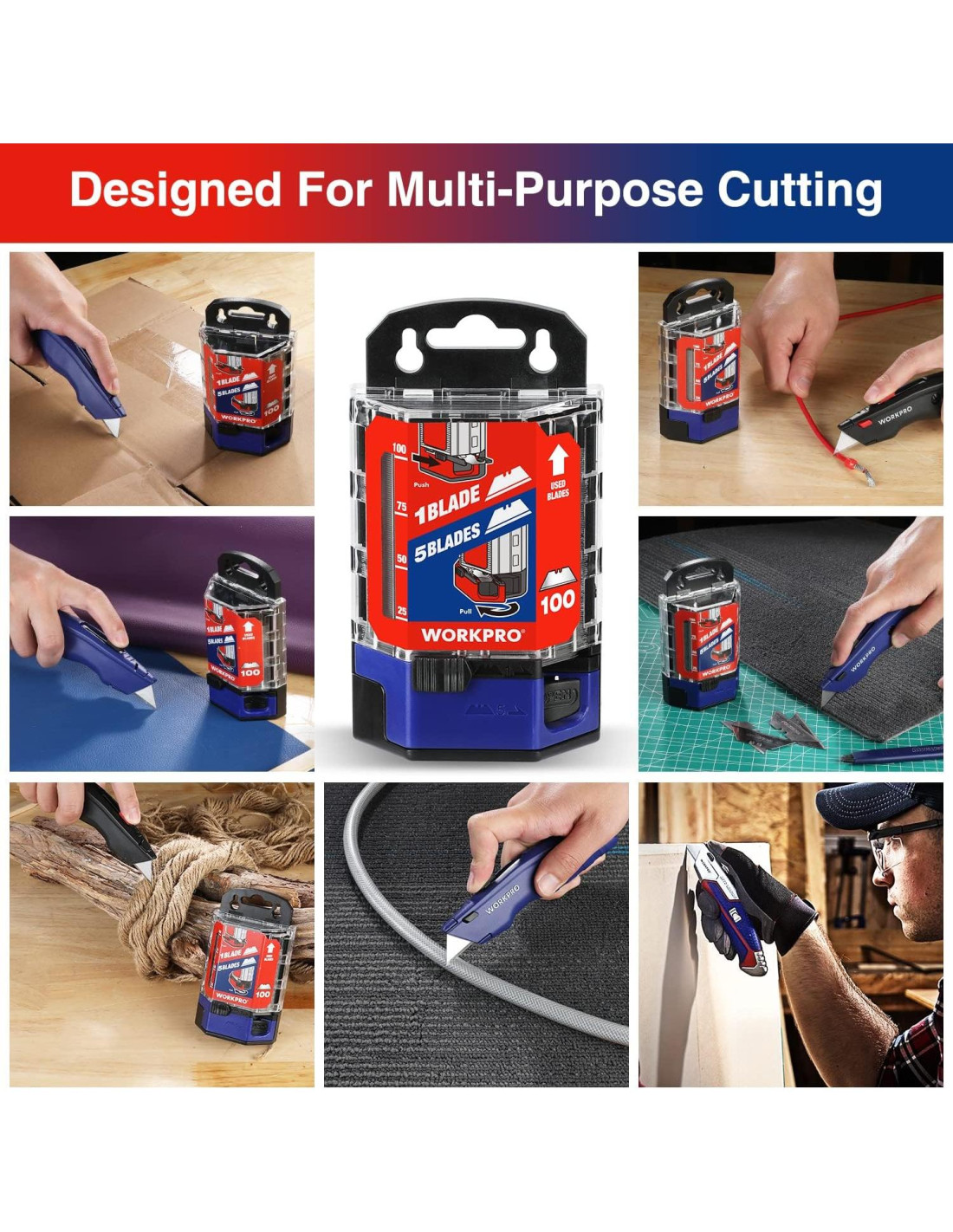 - Amplia Aplicación: Las cuchillas de repuesto para cuchillos utility de WORKPRO son excelentes para cortar una variedad de materiales, como cartón, cuero, alfombra, paneles de yeso, yeso, linóleo, cuerda, metal blando, tubería y papel, y son adecuadas para la mayoría de los Proyectos de Hágalo Usted Mismo