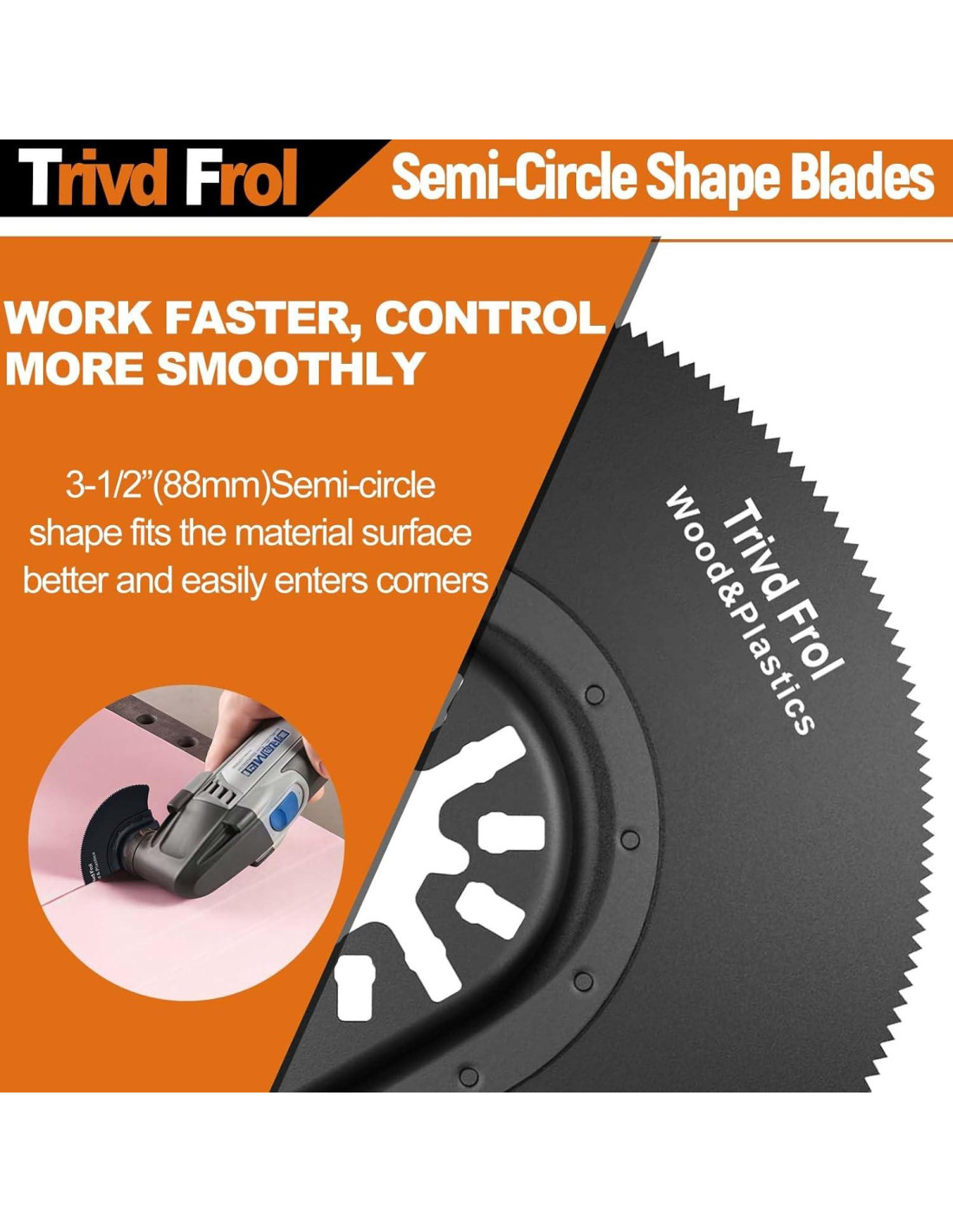 - Dientes Japoneses de Triple Afilado: Con un diseño de ingeniería meticuloso, la fusión del diseño curvado y los beneficios de corte suave distintivos de los dientes japoneses de triple afilado en nuestras cuchillas de multiherramienta. Proporciona una superficie extremadamente limpia para sus proyectos de carpintería.