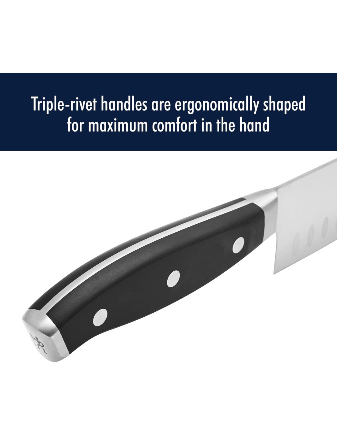- El set incluye cuchillo de pelar de 3" (7.62 cm), cuchillo utilitario serrado de 5" (12.7 cm) y cuchillo santoku de borde hueco de 7" (17.78 cm).