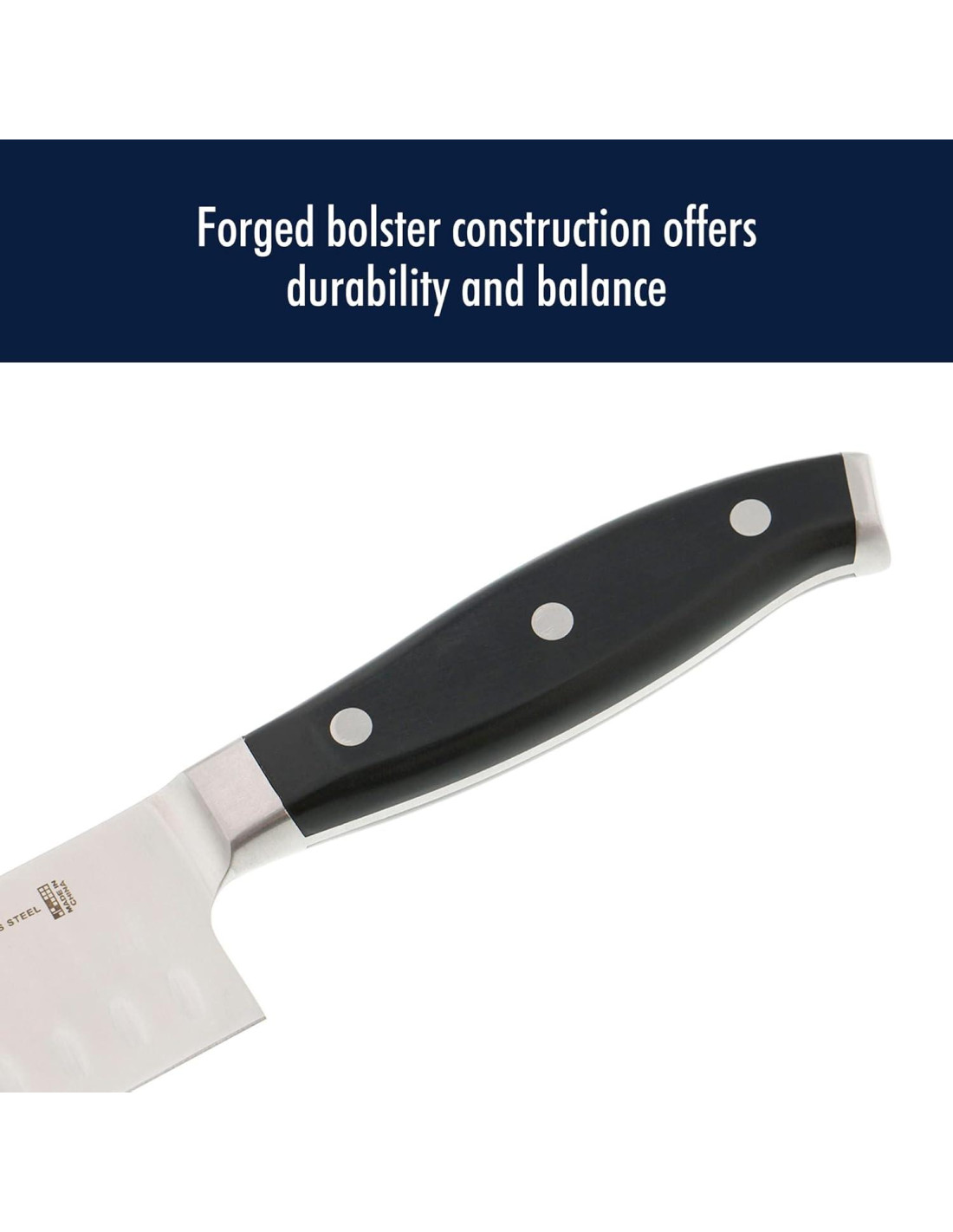 El juego de cuchillos de 3 piezas cuenta con los cuchillos más esenciales en cualquier cocina. Este set incluye un cuchillo de pelar de 3 pulgadas (7.62 cm) para pelar verduras y crear guarniciones, el cuchillo utilitario serrado de 5 pulgadas (12.7 cm) para cortar alimentos con interior blando y exterior duro, y el santoku de estilo asiático de 7 pulgadas (17.78 cm) que presenta una hoja con pequeñas indentaciones, conocidas como grantons, que evitan que los alimentos se peguen al cortar. La construcción del refuerzo forjado de los cuchillos Forged Premio transiciona sin problemas de la hoja al mango para durabilidad y equilibrio. Fabricados con acero inoxidable alemán de alta calidad, las hojas con acabado satinado producen cortes de precisión y están afiladas para una larga durabilidad. Curvado para mayor comodidad, el mango ergonómico de triple remache presenta un elegante tapa de acero inoxidable que añade atractivo estético a su bloque de cuchillos. Estampado con el logo del hombre único de HENCKELS, este Halberdier simboliza la excelente calidad de Forged Premio a un valor notable. El set incluye cuchillo de pelar de 3 pulgadas (7.62 cm), cuchillo utilitario serrado de 5 pulgadas (12.7 cm), santoku de borde hueco de 7 pulgadas (17.78 cm).