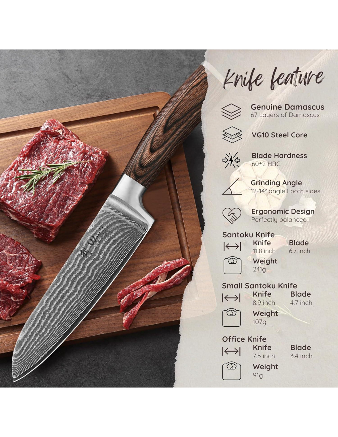 - Set de cuchillos de Damasco de 3 piezas premium: Incluye un cuchillo santoku (30 cm en total, 17 cm hoja), un cuchillo santoku pequeño (23 cm en total, 12 cm hoja) y un cuchillo de oficina (19 cm en total, 9 cm hoja). Cada uno forjado a partir de 67 capas de acero de Damasco genuino con núcleo VG10, ofreciendo afilado y durabilidad de grado profesional.