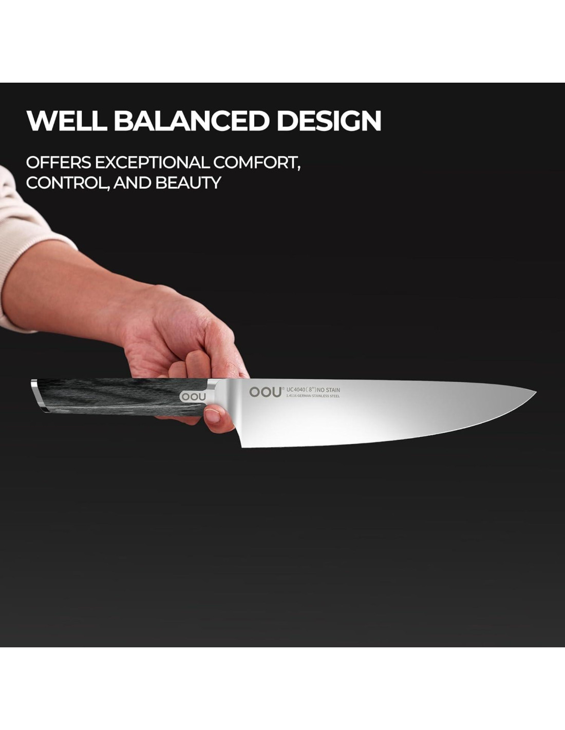 - Cuchilla de Acero de Alto Carbono Alemán 1.4116 Premium. Fabricado con acero alemán de alto carbono 1.4116, este cuchillo de chef ofrece una durabilidad excepcional y un rendimiento extremadamente afilado. El mango ergonómico asegura un agarre cómodo y antideslizante, reduciendo la fatiga de la mano incluso durante la preparación de comidas prolongadas.