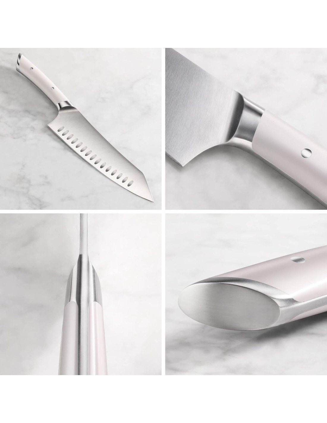 - Los mangos delgados y ergonómicos están diseñados para el ajuste más cómodo, haciendo que cada cuchillo se sienta como una extensión de la mano del usuario. Este cuchillo altamente versátil también cuenta con un borde hueco, que reduce la resistencia en la superficie al cortar y permite que los alimentos se deslicen fácilmente fuera de la hoja.