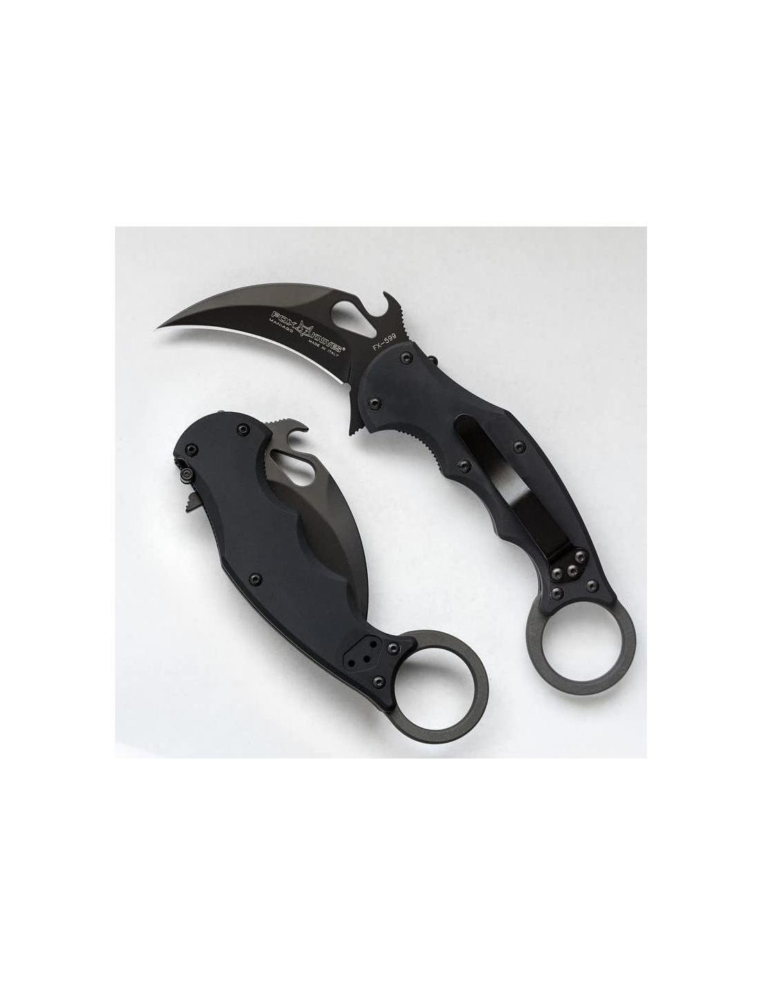 EL NUEVO Fox 599 EVO Negro Cuchillo Karambit Plegable de Aluminio es un diseño exclusivo que ofrece seguridad adicional con el sistema LAWKS, y un potencial de personalización ilimitado con mangos removibles que se pueden desenroscar y cambiar por un nuevo conjunto de mangos en varios diseños y materiales para crear un aspecto completamente nuevo, ¡justo como una funda de teléfono! Mantente atento mientras lanzamos nuevas opciones de mangos para ayudar a que tu karambit Fox EVOLUCIONE!
