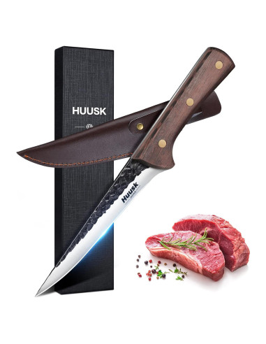 - Cuchillo de Exterior VersátilDebido al diseño especial, nuestro cuchillo de recorte de carnicero Huusk se puede usar para rebanar, cortar, recortar y pelar. Es un buen asistente para chefs o principiantes en la cocina. Con la funda, es fácil de llevar al aire libre para acampar, cazar, BBQ, etc. Este cuchillo de deshuesar también es el regalo perfecto de Navidad para familiares y amigos.