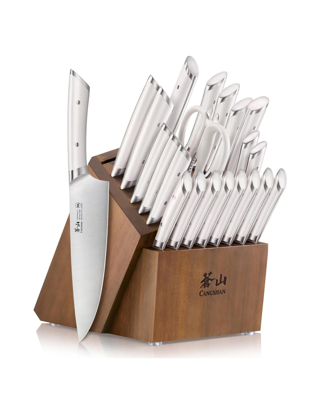 - Juego de 23 Piezas Incluye: Cuchillo de Carving de 9in (22.86cm), Cuchillo de Chef de 8in (20.32cm), Cuchillo Santoku de 7in (17.78cm), Cuchillo de Pan de 8in (20.32cm), Cuchillo Nakiri de 7in (17.78cm), Tenedor de Carving Forjado de 6in (15.24cm), Cuchillo de Deshuesar de 6in (15.24cm), Cuchillo para Tomate de 5in (12.7cm), Cuchillo de Pelar de 2.75in (6.99cm), Cuchillo Utilitario de Bisel Fino de 5in (12.7cm), Cuchillo de Pelar de 3.5in (8.89cm), (8) Cuchillos de Bisel Fino para Carne de 5in (12.7cm), Cuchillo Utilitario Serrado de 5in (12.7cm), Acero de Afilado de 8in (20.32cm), Tijeras Forjadas de 9in (22.86cm), Bloque de Madera de Acacia Sólida