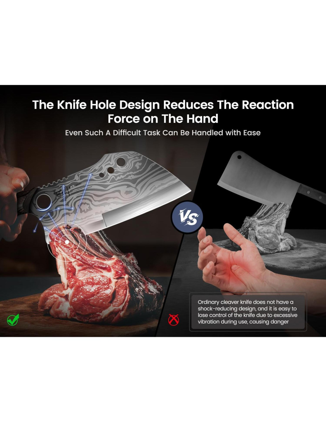 - Por consideración antideslizante, hemos añadido un elemento de dientes de engranaje contemporáneo a este cuchillo de chef. Combinado con la forma clásica general, es tanto hermoso como práctico, asegurando un agarre estable incluso cuando está mojado y garantizando tu seguridad al manejar tu comida.