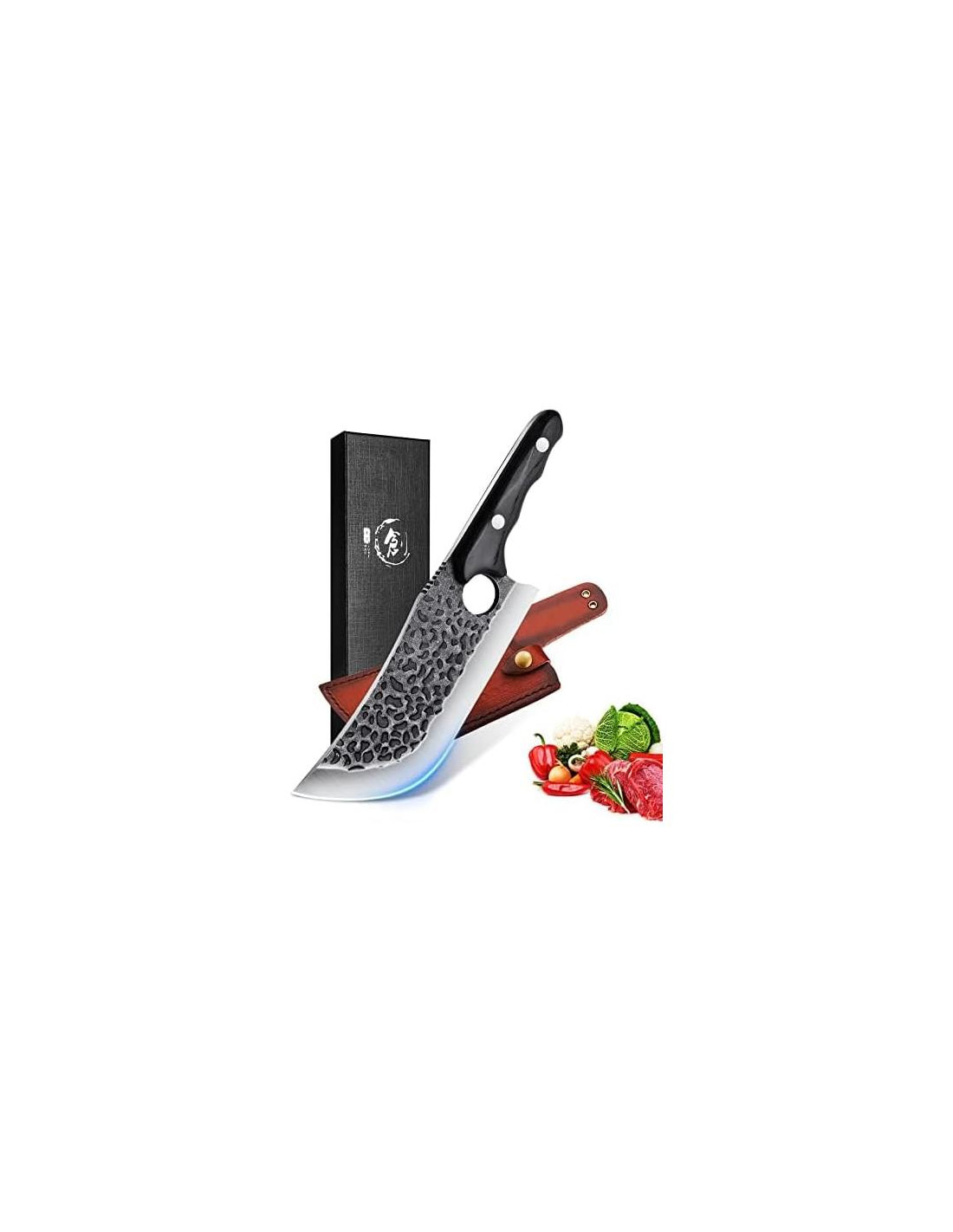 - EXCELENTE ARTESANÍA MANTIENE LA HOJA MÁS TIEMPO, MÁS AFILADA: El cuchillo de chef de cocina se forja a través de 108 procesos, logrando el mejor equilibrio entre dureza y afilado. La distancia entre el patrón de martillo y la hoja es de 5.08 cm, el llamado buen acero se utiliza en la hoja, este cuchillo de carne mejora continuamente la densidad del cuchillo de picar a través de miles de refinamientos, y aún mantiene esta alta afiladura al cortar huesos duros, facilitando el corte.