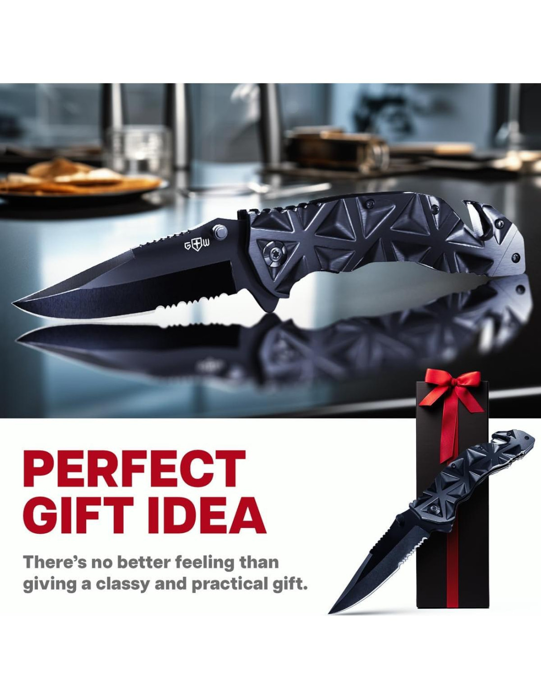 - Cuchillo Asistido por Resorte 3 en 1. El cuchillo plegable está equipado con un cortador de correas, rompedor de cristales y un clip para bolsillo. La mejor herramienta EDC para hombres y mujeres.