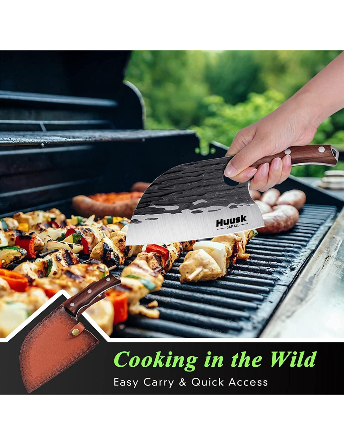 - Contornos Ergonómicos: Un hermoso mango de madera de rosa de full tang del cuchillo de chef serbio asegura un agarre poderoso, antideslizante y cómodo. El cuchillo para cortar huesos de alta resistencia tiene un refuerzo fuerte que puede proteger tus dedos. Puedes liberarte con la posición del agujero de seguridad en el centro del cuchillo de cocina al aire libre cuando se queda atascado al cortar carne.