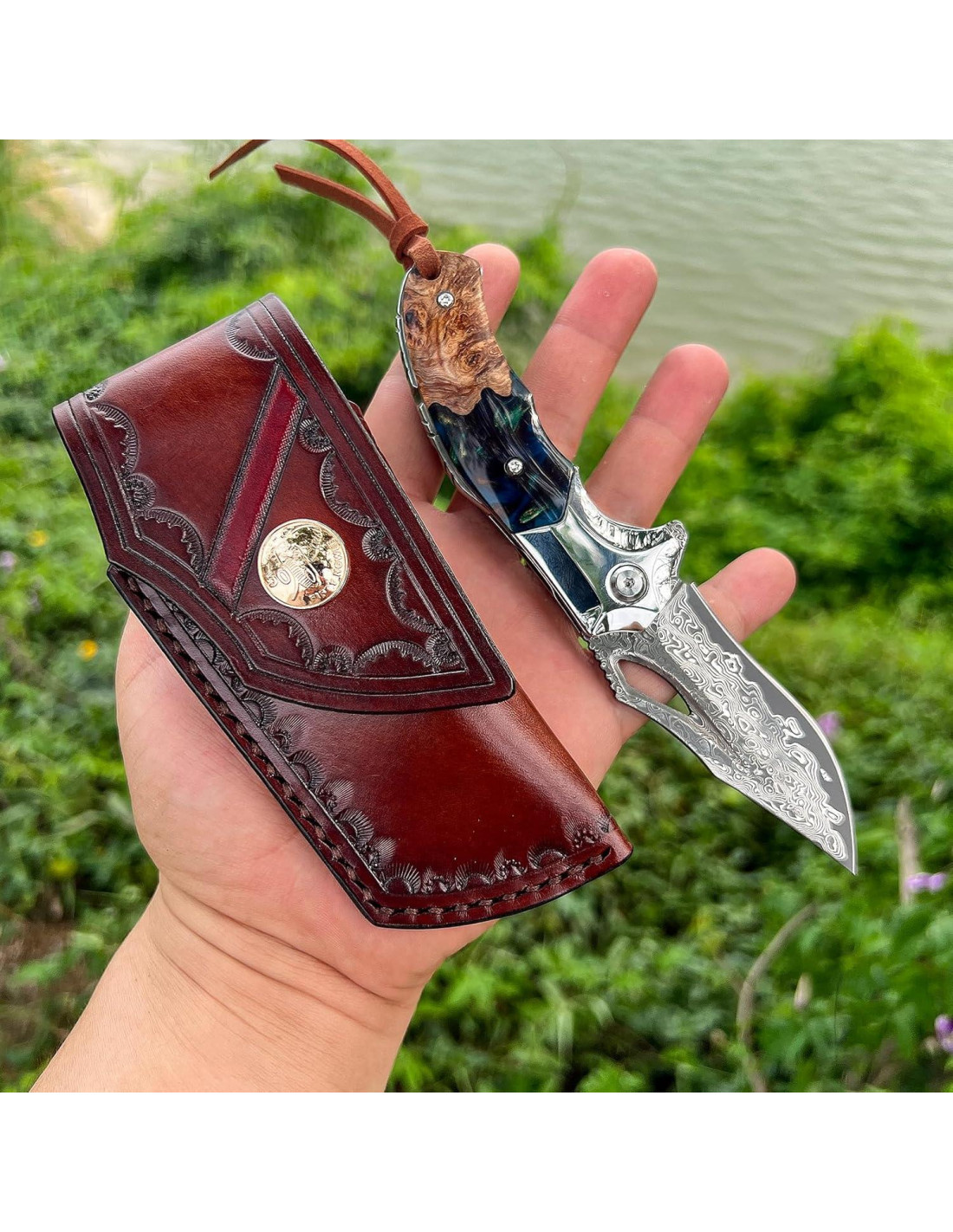 - Elegante funda de cuero: Está hecha a mano por artesanos, tallada y cosida. Es hermosa y conveniente de llevar. Es pequeña y práctica. El cuchillo se puede llevar fácilmente plegándolo y colocándolo en el bolsillo. También se puede usar como regalo o colección, es tu cuchillo de bolsillo EDC ideal.