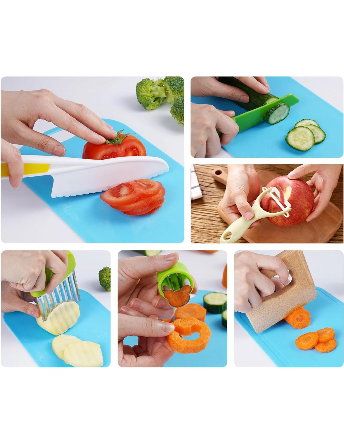 - HERRAMIENTAS DE COCINA VERSÁTILES PARA NIÑOS - Estos juegos de tabla de cortar y cuchillo para niños son perfectos para introducir a los niños en la cocina. Cuando cocinas con tus hijos, les estás enseñando, no solo sobre comida, sino también matemáticas básicas, habilidades motoras finas, multitarea y gestión del tiempo. Además, si tienes un comensal exigente, involucrarlos en el proceso puede ayudar a emocionarlos con nuevos alimentos. ¡Déjalos ser creativos, divertirse y desarrollar hábitos alimenticios saludables desde una edad temprana!