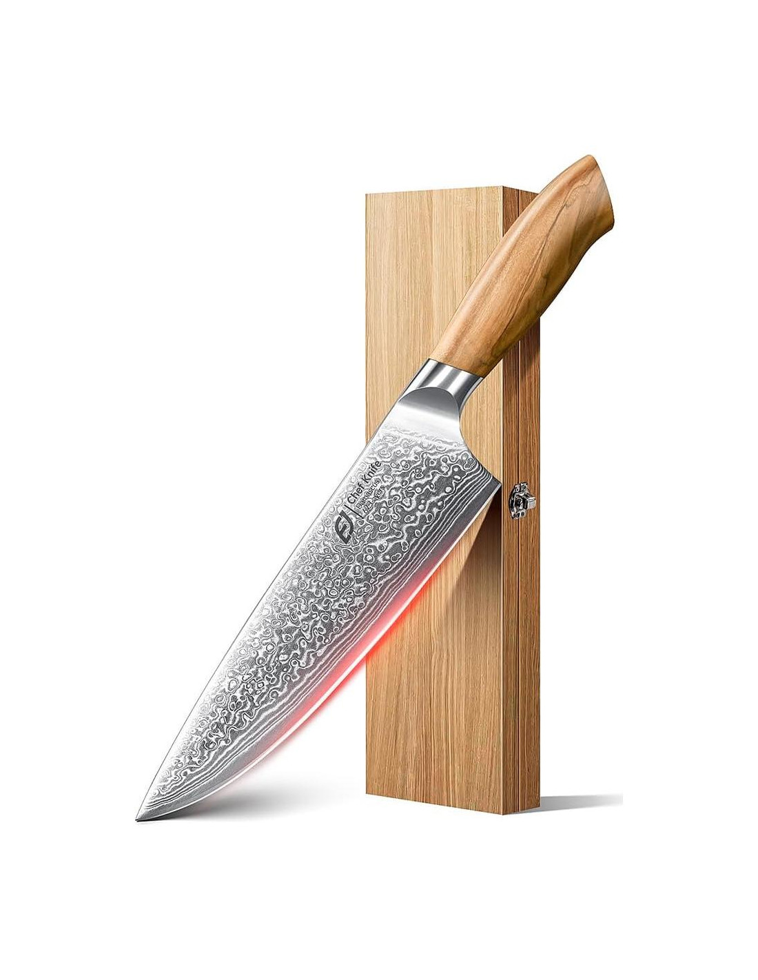 - [Cuchillo de Damasco Real] El cuchillo de chef tiene un afilado de precisión controlado por láser para un borde de 15, lo que le da un mejor ángulo de trabajo al cortar. El revestimiento de 67 capas de Damasco asegura durabilidad mientras añade patrones elegantes y a prueba de óxido, perfecto tanto para cocinas profesionales como para uso en casa.