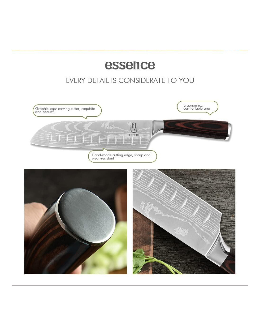 - El mango ergonómico proporciona un agarre sólido mientras que la forma del refuerzo ofrece un peso y equilibrio óptimos. El mango de madera pakka antideslizante puede mantener su fricción incluso cuando el mango está mojado, haciendo que el corte sea más seguro y sin esfuerzo.