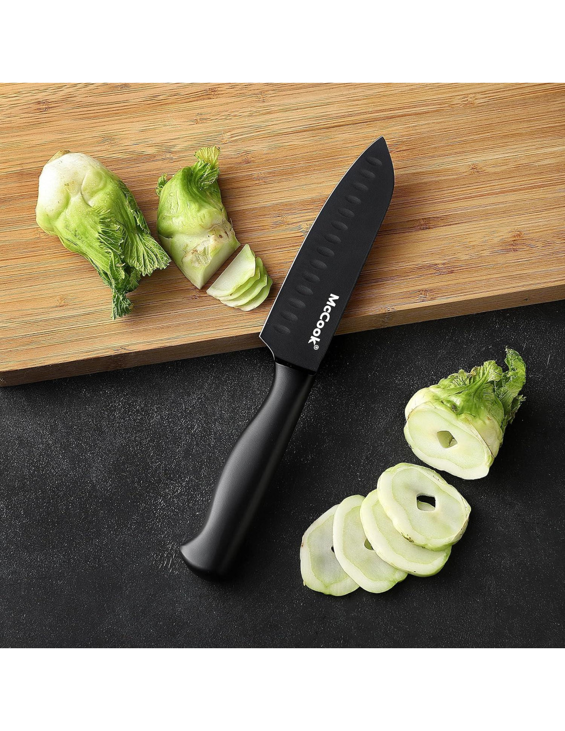 - Antiadherente y resistente a la oxidación: el recubrimiento negro previene la oxidación del acero, por lo que el conjunto de cuchillos de cocina permanecerá antiadherente y resistente a la oxidación durante años.