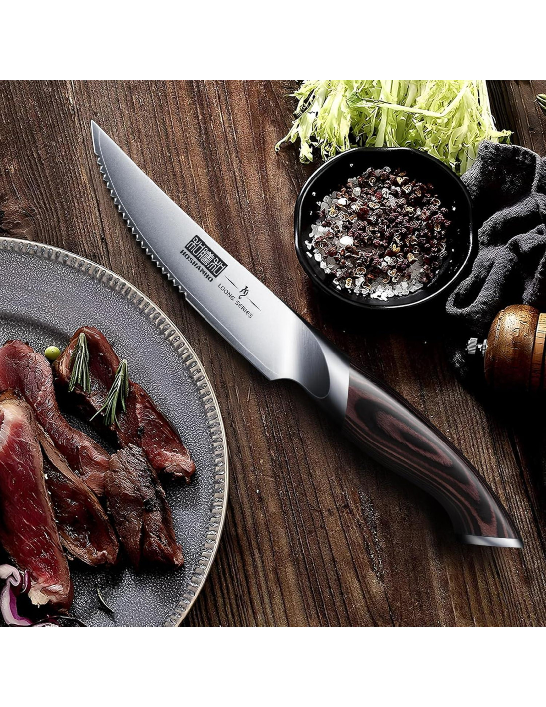 - Acero al carbono japonés: los cuchillos para carne de cocina HOSHANHO están fabricados con acero inoxidable de alta calidad japonés 10Cr15CoMoV, especialmente tratados térmicamente y templados con hielo para dar a los cuchillos alta dureza (60 HRC) mientras garantizan durabilidad a largo plazo y hojas ultra afiladas.