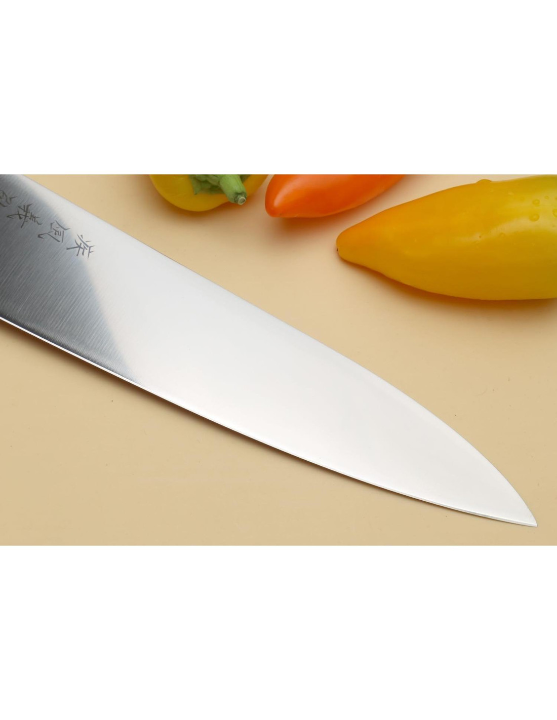 El cuchillo más versátil y esencial que un cocinero puede tener es un cuchillo de chef japonés conocido como cuchillo Gyuto. El Gyuto es un cuchillo de chef japonés con una hoja curva que se balancea suavemente hacia adelante y hacia atrás y tiene una punta extendida para un corte rápido que se puede usar para cortar carne, pescado y verduras. Nuestra serie de Molybdeno Endurecido por Hielo está hecha forjando una sola pieza de acero inoxidable de alto carbono Aus-10. El endurecimiento por hielo es un proceso que ayuda a extraer la dureza del acero refinado mientras se infunde con suficiente resiliencia para funcionar de manera consistente en las condiciones más exigentes. Estos cuchillos son perfectos para aquellos que buscan una hoja delgada, extremadamente afilada y de doble filo que sea ligera. La fabricación tradicional de cuchillos japoneses valora un borde afilado, lo que requiere atención y cuidado. El afilado y el pulido deben hacerse solo con piedras de afilar de agua. Lavar a mano y secar solo, y hacerlo inmediatamente si se trabaja con ingredientes ácidos. No usar en objetos como huesos, cáscaras de nueces y alimentos congelados.