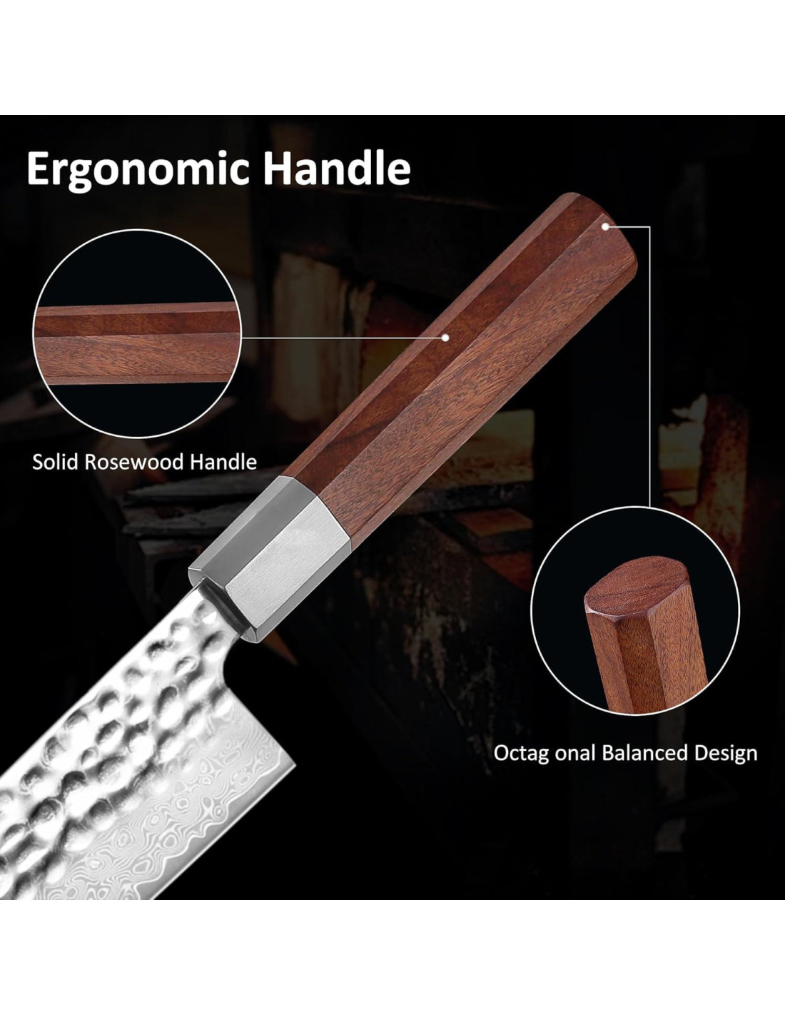 - MANGO DE MADERA ERGONÓMICO - Cuchillo de chef japonés de damasco con mango de madera ergonómico que mantiene la máxima comodidad y control con el cuchillo de cocina pulido a mano, asegura estabilidad y equilibrio óptimos que lo hacen perfecto para el uso diario.