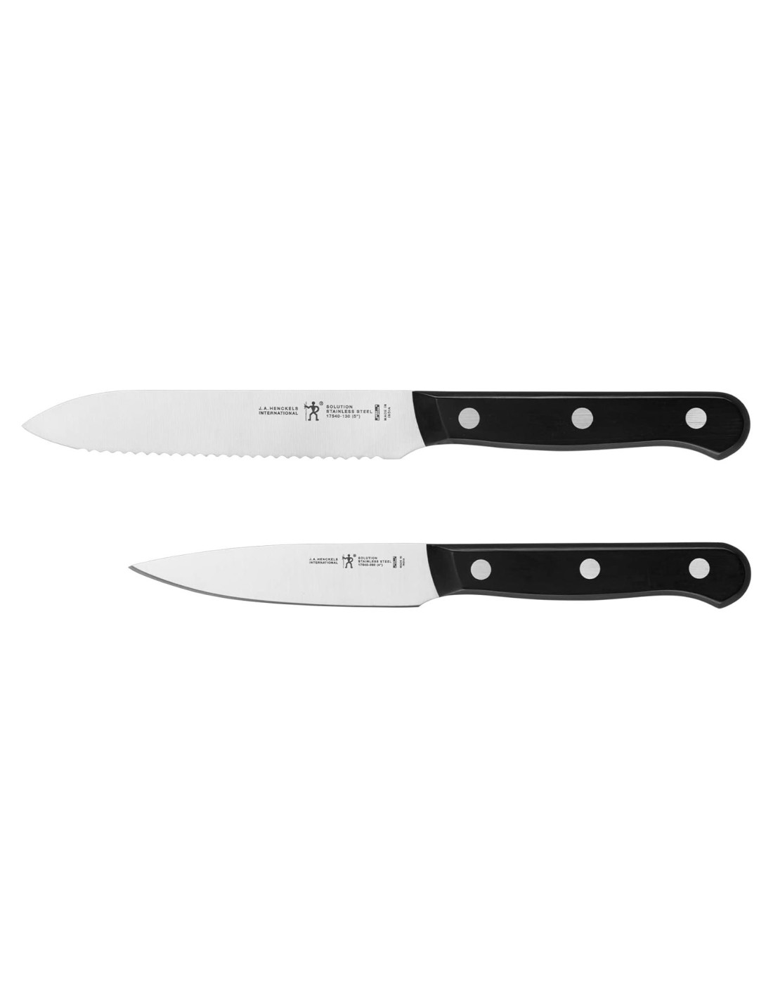 Equipa tu cocina por menos con estos cuchillos esenciales. El set de 2 piezas incluye dos cuchillos clave en la cocina: el cuchillo utilitario serrado y el cuchillo de pelar. El cuchillo utilitario serrado compacto es para cortar alimentos con un exterior duro y un interior blando, como tomates, salami y bagels. El cuchillo de pelar es ideal para trabajos a menor escala como pelar verduras y segmentar frutas. Afilados para una durabilidad prolongada, estas hojas de filo fino hacen que la preparación en la cocina sea rápida. Desde 1895, Henckels ha estado fabricando cuchillos de alta calidad a un valor excepcional. Los cuchillos Solution están diseñados para abordar cada tarea de cocina. Fabricados con acero inoxidable de alta calidad, las hojas de cuchillo de una sola pieza y estampadas con precisión son ligeras sin sacrificar la resistencia y durabilidad. Curvadas para mayor comodidad, los mangos a prueba de roturas y de triple remache son agradables al tacto, dándote el control que necesitas para cortar con facilidad. Este mango ergonómico te permite disfrutar de una máxima maniobrabilidad y un corte sin fatiga.