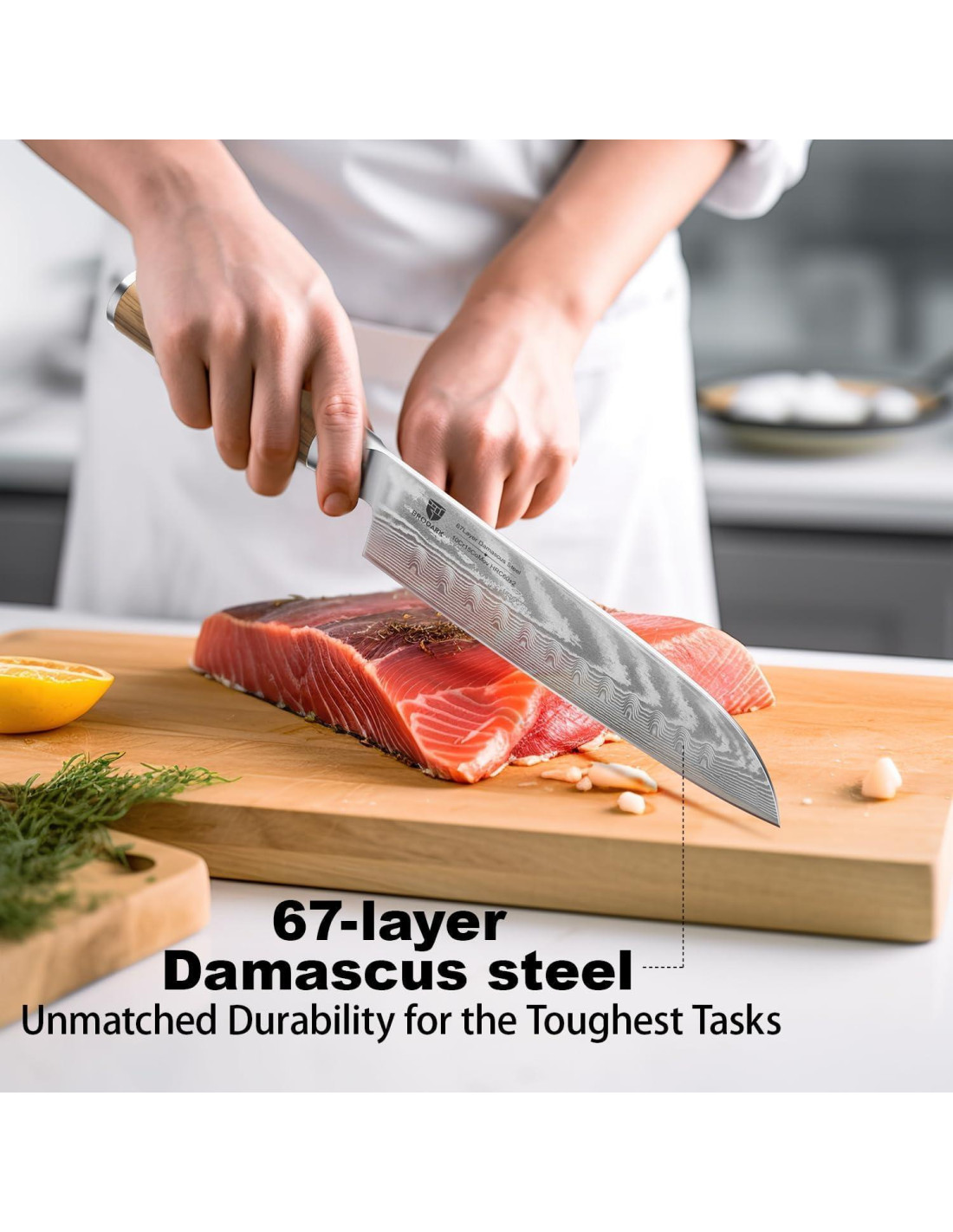 - [TEMPERADO A TRAVÉS DE MIL DIFICULTADES] El cuchillo Santoku de Damasco está hecho de 67 capas de acero de Damasco, incluyendo un núcleo de acero japonés VG-10. Se forma mediante apilamiento, forjado y estiramiento repetidos, por lo que la hoja es fuerte y resistente. El acero de Damasco plegado se trata para eliminar la capa de oxidación superficial y las impurezas, mientras se forma una textura distintiva, proporcionando tanto atractivo estético como un rendimiento de corte excepcional.