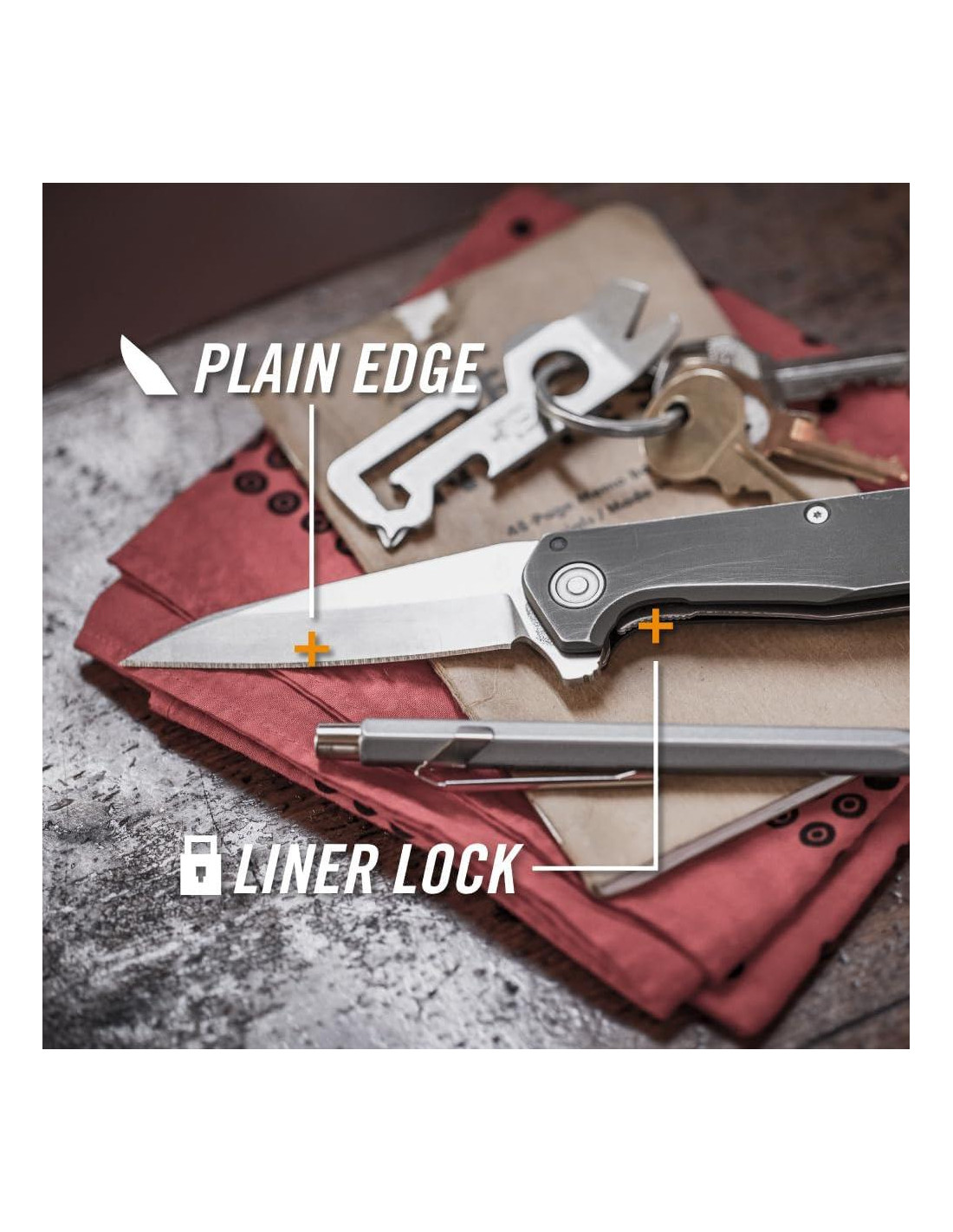 - Diseñado como un cuchillo delgado y ligero con un solo liner para una hoja de 3 in. (7.62 cm) descentrada