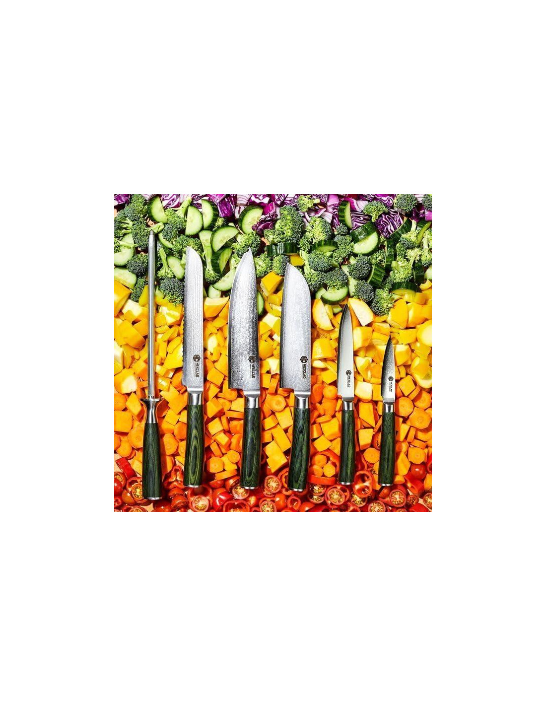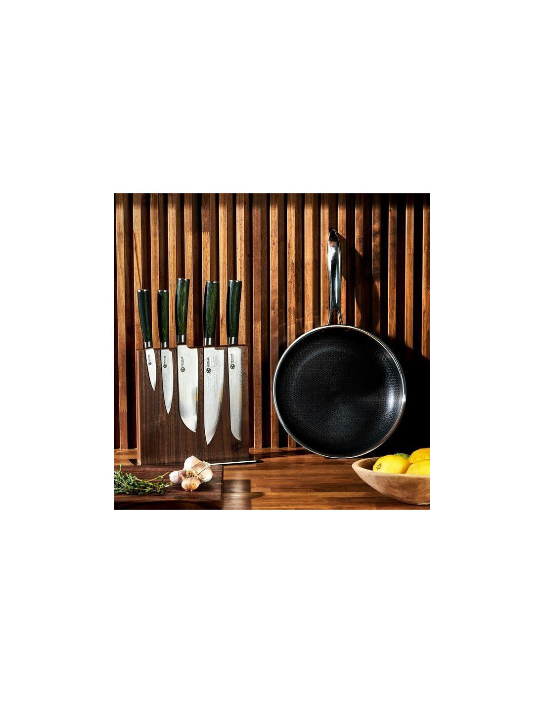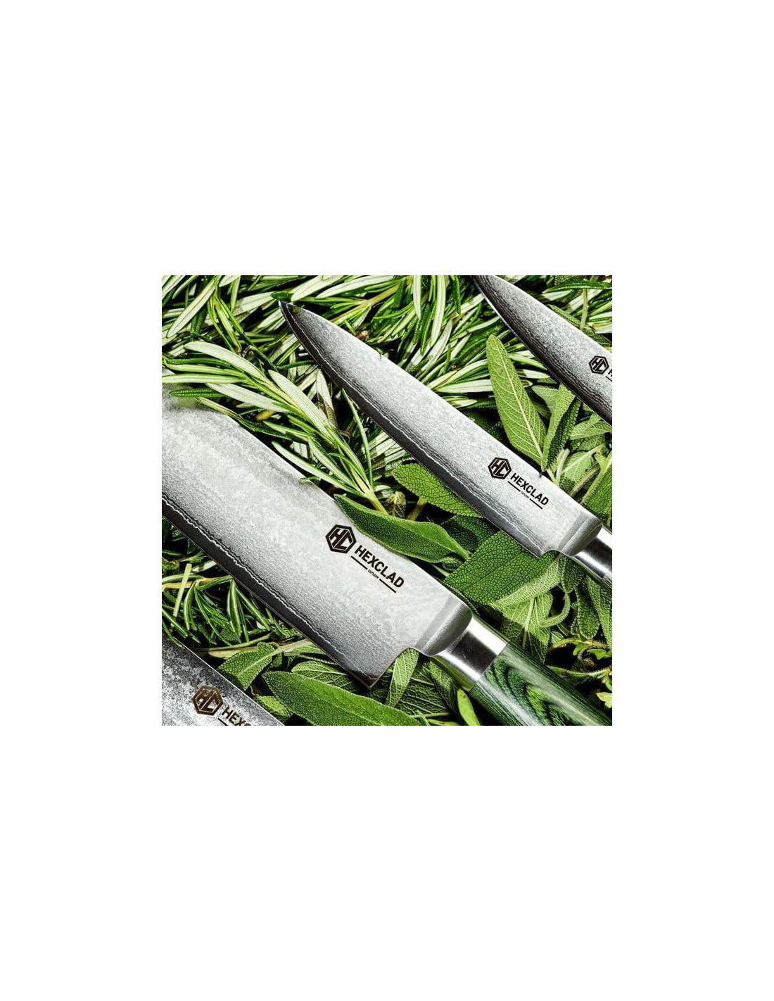 - Nuestra colección de cuchillos HexClad de acero japonés Damascus es el surtido esencial de cuchillos que toda cocina necesita, incluyendo un cuchillo de chef de 20 cm, un cuchillo de pan de 20 cm, un cuchillo de deshuesar de 15 cm, un cuchillo de utilidad de 13 cm, un cuchillo de pelar de 9 cm y una varilla de afilar de 23 cm.