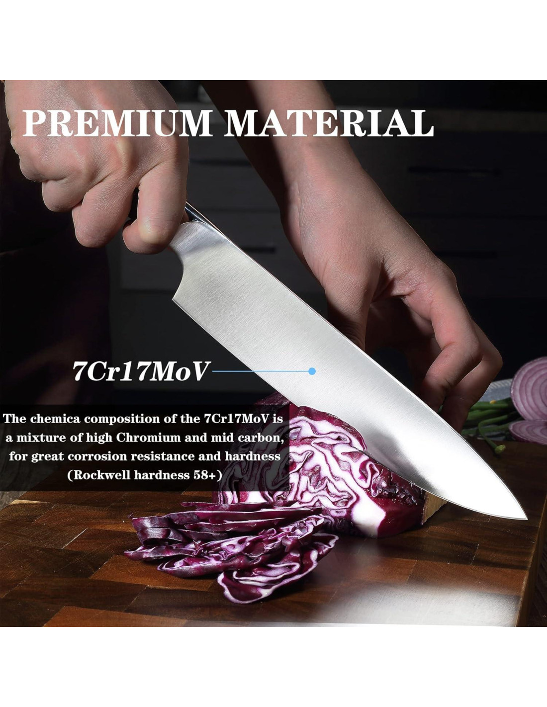- Cuchillo multifuncional -- Este cuchillo de chef de 8 pulgadas (20.32 cm) puede manejar fácilmente muchos ingredientes diarios, como picar, rebanar, cortar en cubos y picar todo tipo de carne, verduras, frutas y pan. Es adecuado tanto para la cocina de casa como para la de restaurante.