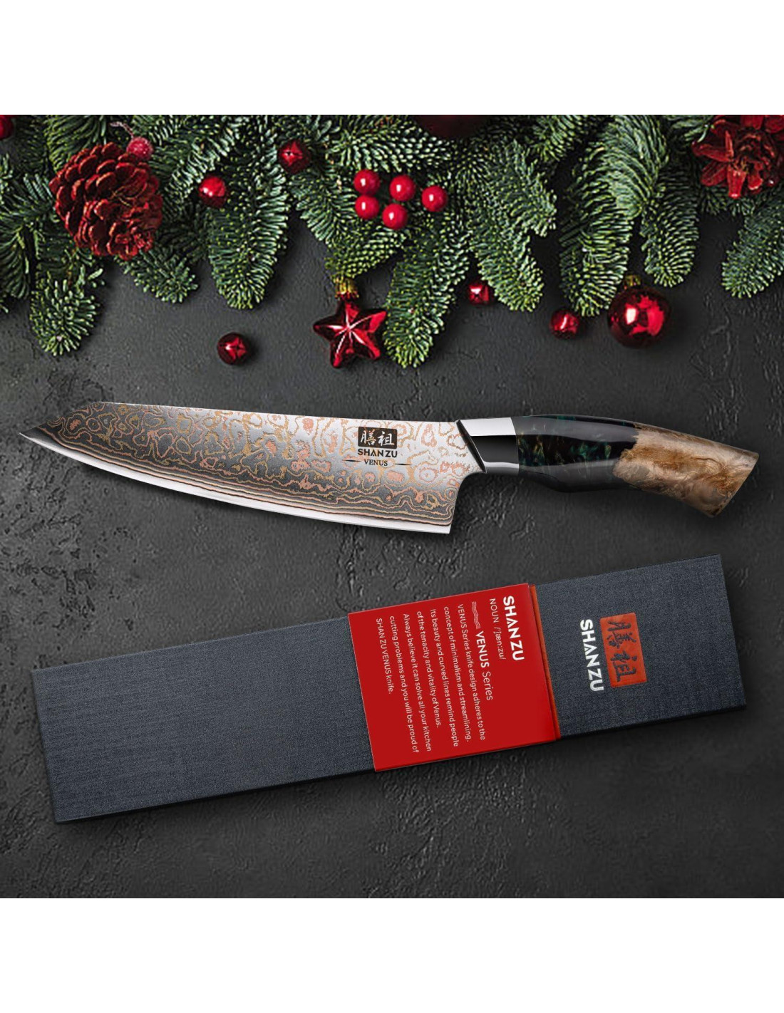- [Cuchillo de Chef Coleccionable y Bien Balanceado] Este cuchillo de chef de 8 pulgadas, diseñado de manera excepcional y bien balanceado, vale la pena coleccionarlo, y viene con una caja de regalo. Puedes regalarlo a tus seres queridos y amigos. SHAN ZU también proporciona un servicio de compras sin preocupaciones, por favor contáctanos si tienes alguna pregunta