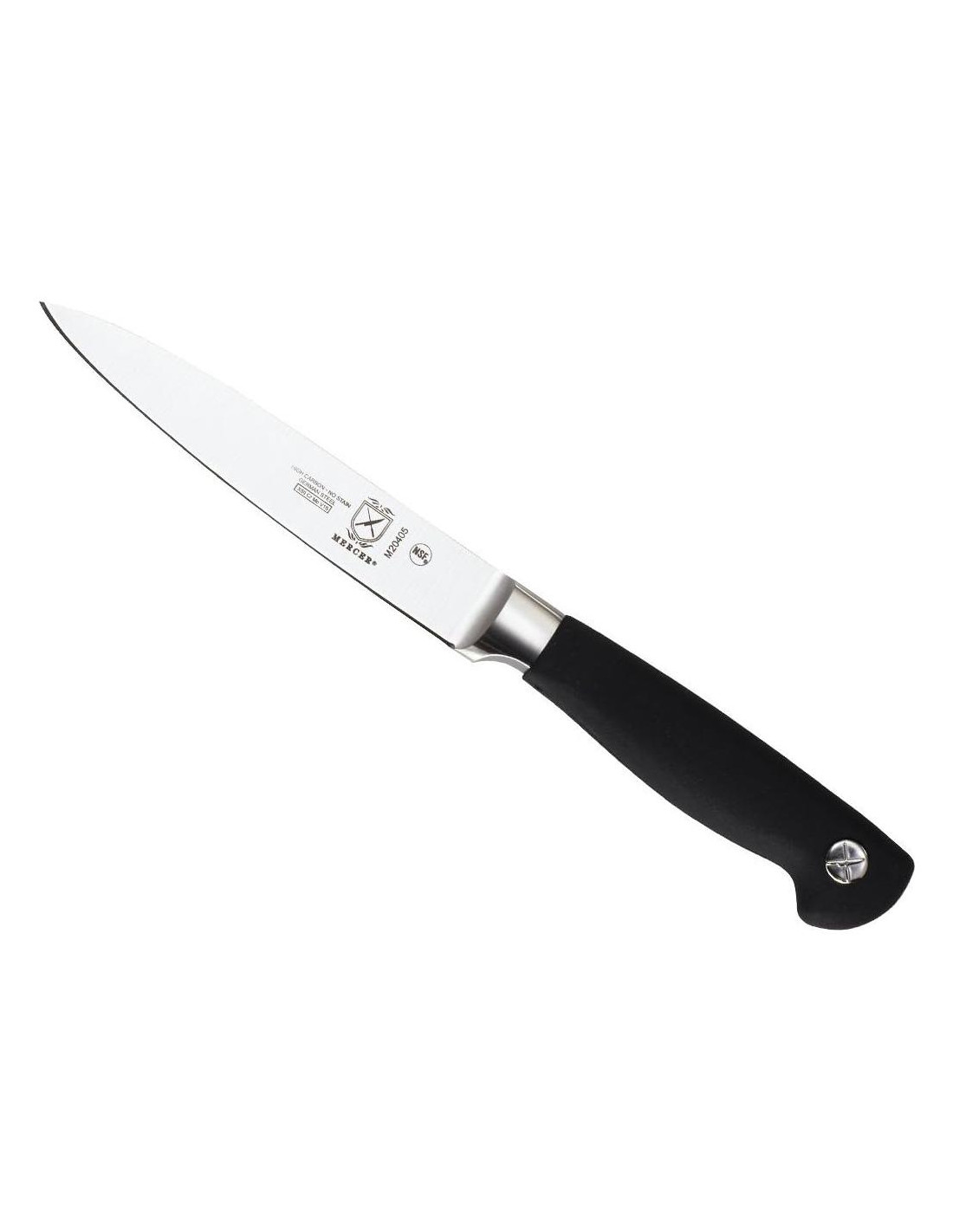 Descripción del Producto Cuchillo de Utilidad Forjado de 5 Pulgadas Mercer Culinary Genesis Amazon.com Un proveedor de la gran mayoría de academias de cocina, Mercer Cutlery ofrece la Colección Genesis de cuchillos de cocina para proporcionar calidad profesional al chef en casa. Cómodos, duraderos y eficientes, los cuchillos Genesis cuentan con hojas forjadas completamente, de una sola pieza, hechas de acero alemán de alto carbono y sin manchas. Sus bordes de afilado en forma de cono son pulidos a mano, y sus refuerzos sustanciales proporcionan un equilibrio útil. Los mangos de Santoprene negro antideslizante hacen que los cuchillos Genesis sean cómodos y seguros en la mano, mejorando la eficiencia y la seguridad en la cocina. El tipo de cuchillo que se utiliza numerosas veces al día, este cuchillo de utilidad de 5 pulgadas Genesis es perfecto para cortar sándwiches, picar manzanas y recortar quesos duros. Un complemento para los cuchillos de chef, tallado y santoku de Genesis, la pieza está hecha en Taiwán utilizando componentes y tecnología europeos. Debe lavarse a mano para obtener los mejores resultados y cuenta con la garantía de un año de Mercer. --Emily Bedard